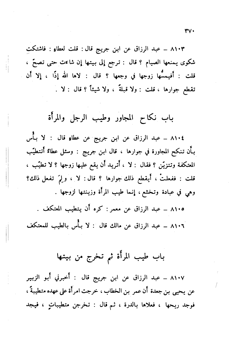 8104 - عَنِ ابْنِ جُرَيْجٍ، عَنْ عَطَاءٍ قَالَ: لَا بَأْسَ بِأَنْ تُنْكَحَ الْمُجَاوِرَةُ فِي جِوَارِهَا، قَالَ ابْنُ جُرَيْجٍ: وَسُئِلَ عَطَاءٌ §أَتَتَطَيَّبُ الْمُعْتَكِفَةُ، وَتَتَزَيَّنُ؟ فَقَالَ: «لَا، أَتُرِيدُ أَنْ يَقَعَ عَلَيْهَا زَوْجُهَا؟ لَا تَطَيَّبُ»، قُلْتُ: فَفَعَلَتْ، أَيَقْطَعُ ذَلِكَ جِوَارَهَا؟ قَالَ: «لَا، وَلِمَ تَفْعَلُ ذَلِكَ، وَهِيَ فِي عِبَادَةٍ، وَتَخَشُّعٍ؟ إِنَّمَا طِيبُ الْمَرْأَةِ، وَزِينَتُهَا لِزَوْجِهَا»