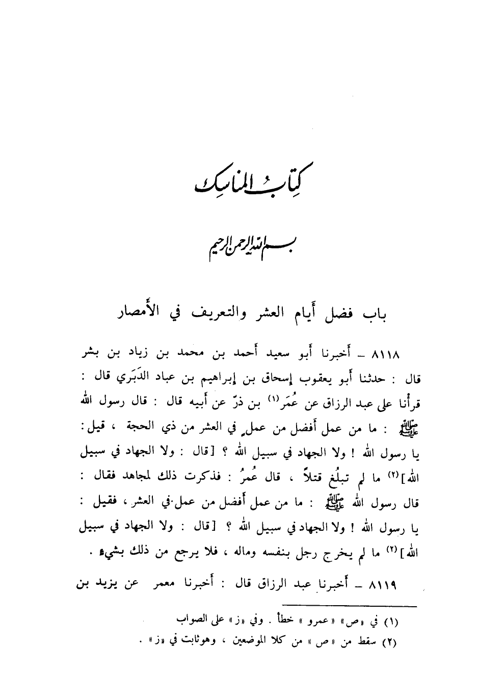 8118 - أَخْبَرَنَا أَبُو سَعِيدٍ أَحْمَدُ بْنُ مُحَمَّدِ بْنِ زِيَادِ بْنِ بِشْرٍ قَالَ: حَدَّثَنَا أَبُو يَعْقُوبَ إِسْحَاقُ بْنُ إِبْرَاهِيمَ بْنِ عَبَّادٍ الدَّبَرِيُّ قَالَ: قَرَأْنَا عَلَى عَبْدِ الرَّزَّاقِ، عَنْ عُمَرَ بْنِ ذَرٍّ، عَنْ أَبِيهِ قَالَ: قَالَ رَسُولُ اللَّهِ صَلَّى اللهُ عَلَيْهِ وَسَلَّمَ: «§مَا مِنْ عَمَلٍ أَفْضَلُ مِنْ عَمَلٍ فِي الْعَشْرِ مِنْ ذِي الْحِجَّةِ»، قِيلَ: يَا رَسُولَ اللَّهِ وَلَا الْجِهَادُ فِي سَبِيلِ اللَّهِ قَالَ: «وَلَا الْجِهَادُ فِي سَبِيلِ اللَّهِ مَا لَمْ تَبْلُغْ قَتْلًا»