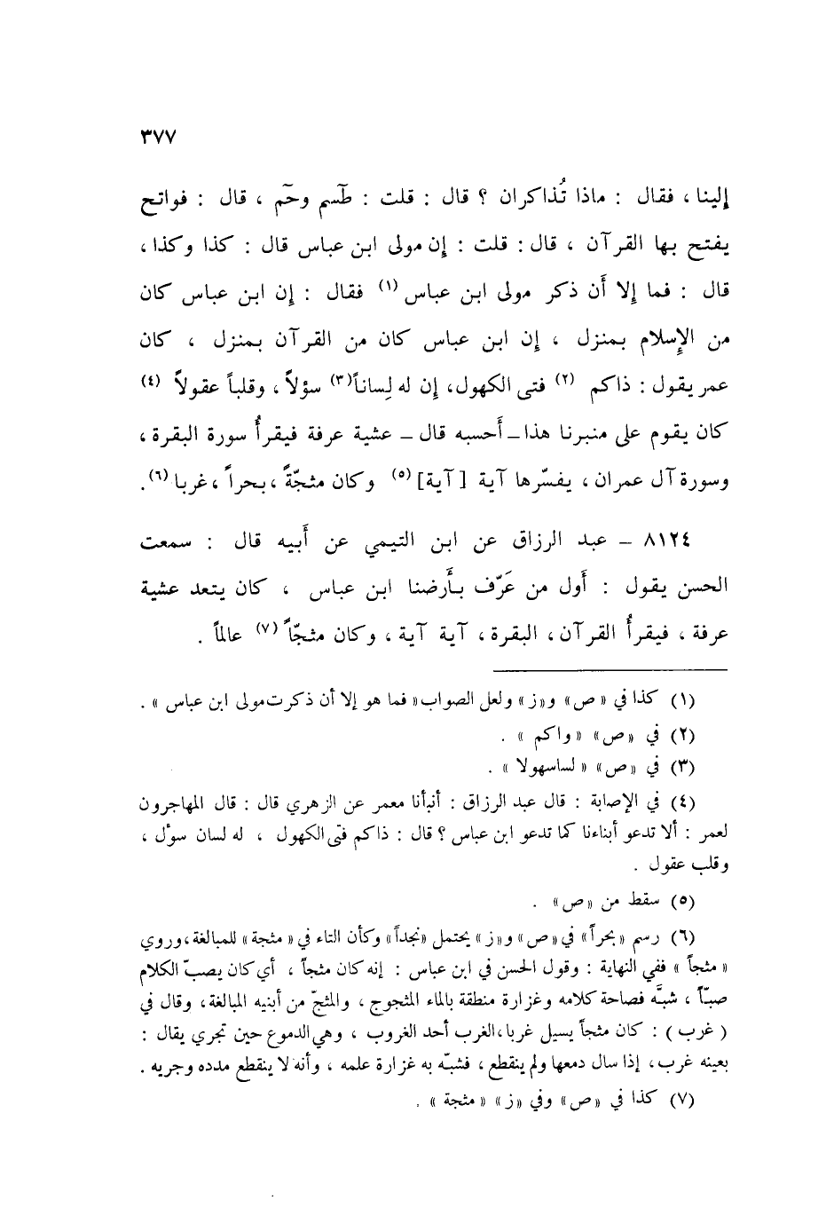 8124 - عَنِ ابْنِ التَّيْمِيِّ، عَنْ أَبِيهِ قَالَ: سَمِعْتُ الْحَسَنَ يَقُولُ: «§أَوَّلُ مَنْ عَرَّفَ بِأَرْضِنَا ابْنُ عَبَّاسٍ كَانَ يَتَّعِدُّ عَشِيَّةَ عَرَفَةَ، فَيَقْرَأُ الْقُرْآنَ الْبَقَرَةَ آيَةً آيَةً، وَكَانَ مَثَجًّا عَالِمًا»