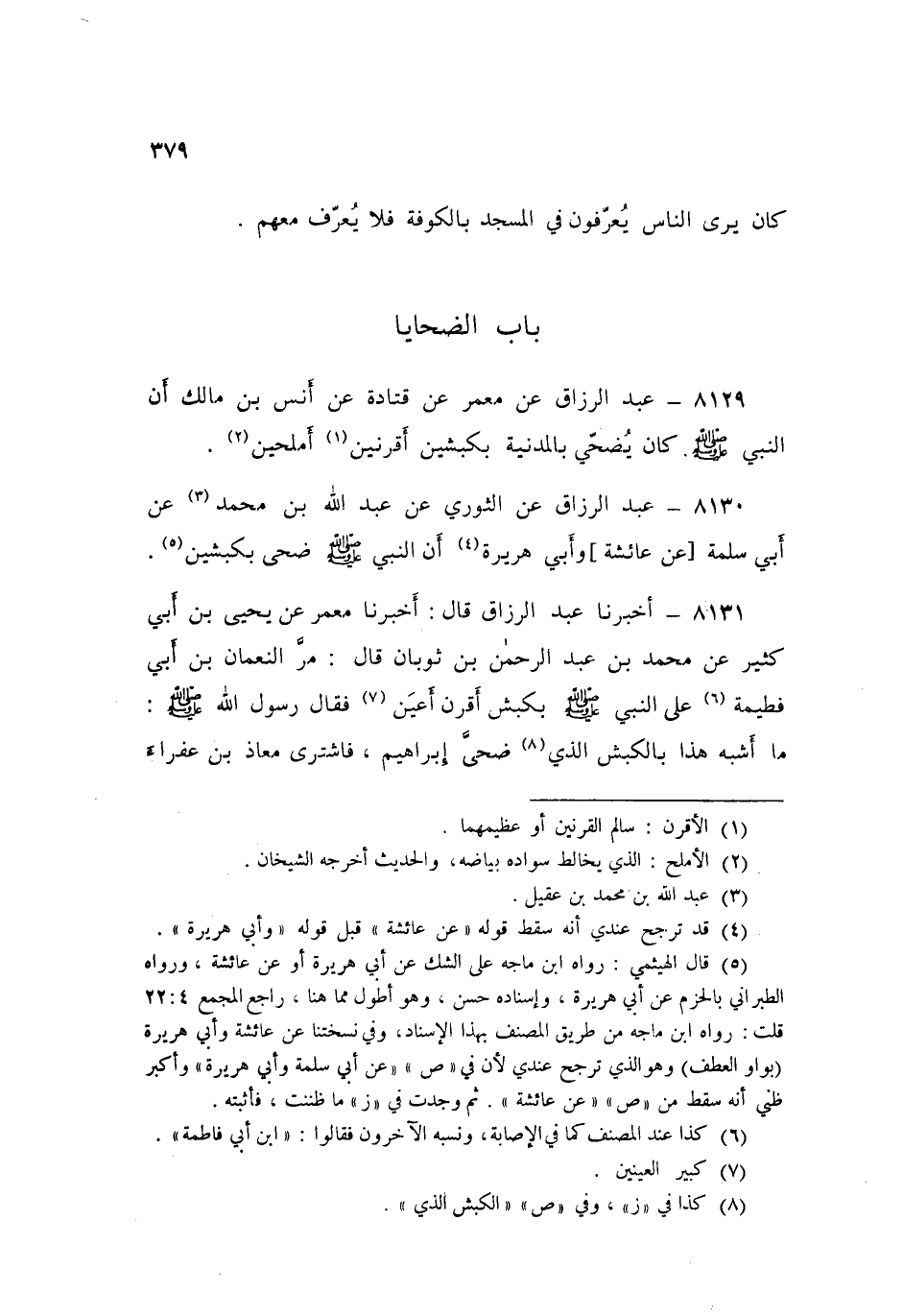 8131 - عَبْدُ الرَّزَّاقِ قَالَ: أَخْبَرَنَا مَعْمَرٌ، عَنْ يَحْيَى بْنِ أَبِي كَثِيرٍ، عَنْ مُحَمَّدِ بْنِ عَبْدِ الرَّحْمَنِ بْنِ ثَوْبَانَ قَالَ: مَرَّ النُّعْمَانُ بْنُ أَبِي فُطَيْمَةَ عَلَى النَّبِيِّ صَلَّى اللهُ عَلَيْهِ وَسَلَّمَ بِكَبْشٍ أَقْرَنَ أَعْيَنَ، فَقَالَ رَسُولُ اللَّهِ صَلَّى اللهُ عَلَيْهِ وَسَلَّمَ: «§مَا أَشْبَهَ هَذَا بِالْكَبْشِ الَّذِي ضَحَّى إِبْرَاهِيمُ» فَاشْتَرَى مُعَاذُ بْنُ عَفْرَاءَ كَبْشًا أَقْرَنَ أَعْيَنَ، فَأَهْدَاهُ لِلنَّبِيِّ صَلَّى اللهُ عَلَيْهِ وَسَلَّمَ «فَضَحَّى بِهِ»