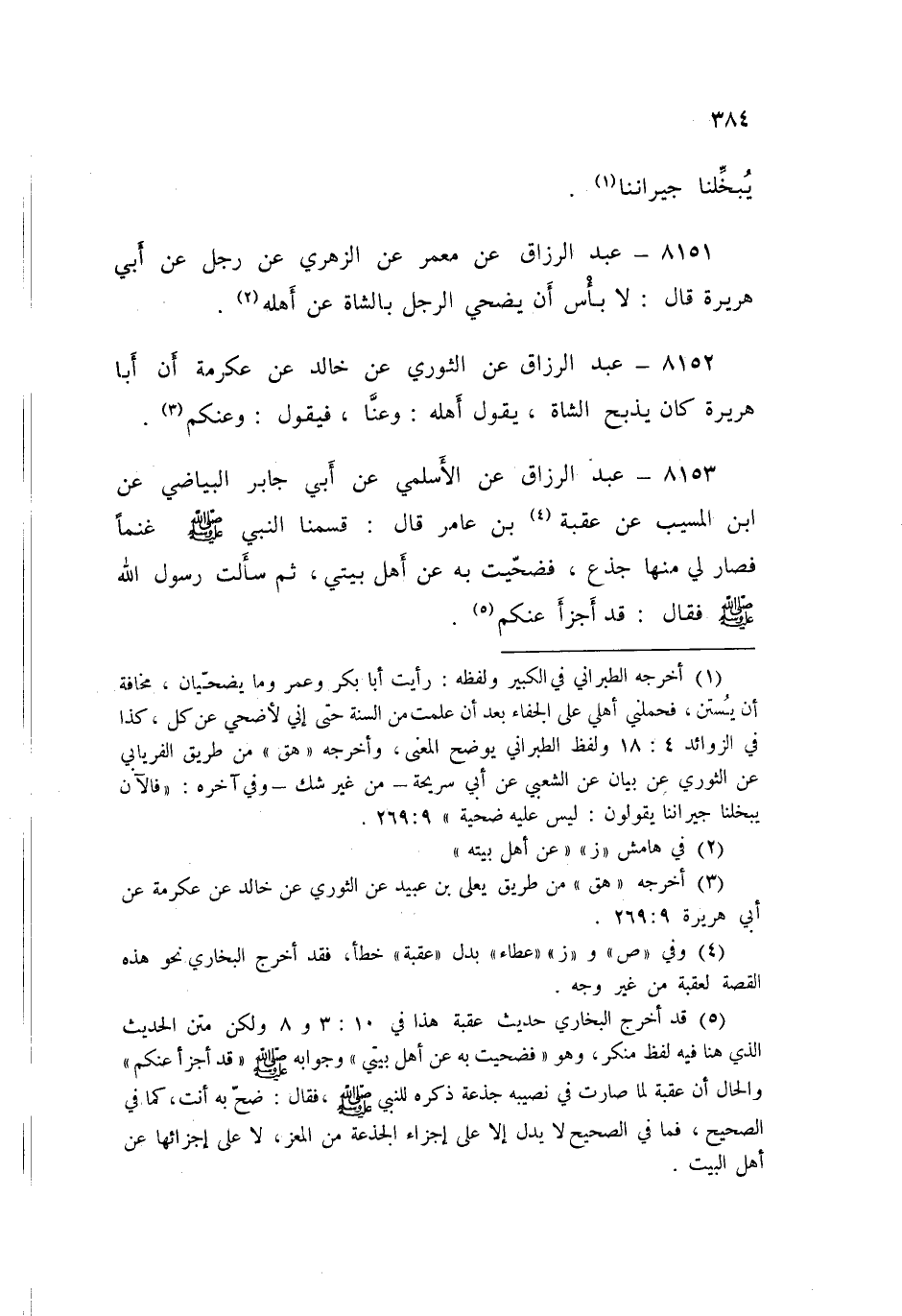 8152 - عَنِ الثَّوْرِيِّ، عَنْ خَالِدٍ، عَنْ عِكْرِمَةَ، أَنَّ أَبَا هُرَيْرَةَ كَانَ §يَذْبَحُ الشَّاةَ يَقُولُ أَهْلُهُ: وَعَنَّا، فَيَقُولُ: «وَعَنْكُمْ»