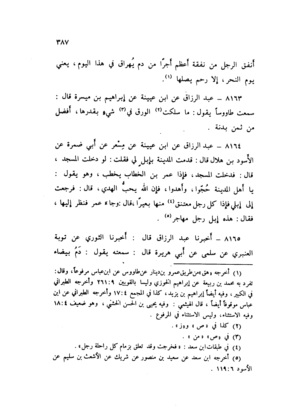 8165 - عَبْدُ الرَّزَّاقِ قَالَ: أَخْبَرَنَا الثَّوْرِيُّ، عَنْ تَوْبَةَ الْعَنْبَرِيِّ، عَنْ سَلْمَى، عَنْ أَبِي هُرَيْرَةَ قَالَ: سَمِعْتُهُ يَقُولُ: «§دَمُ بَيْضَاءَ أَحَبُّ إِلَى اللَّهِ مِنْ دَمِ سَوْدَاوَيْنِ»