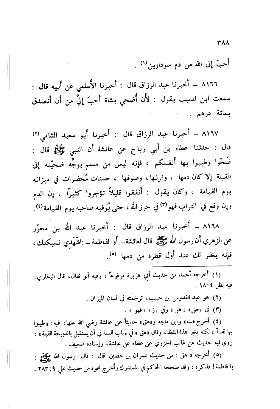 8167 - عَبْدُ الرَّزَّاقِ قَالَ: أَخْبَرَنَا أَبُو سَعِيدٍ الشَّامِيُّ قَالَ: حَدَّثَنَا عَطَاءُ بْنُ أَبِي رَبَاحٍ، عَنْ عَائِشَةَ، أَنَّ النَّبِيَّ صَلَّى اللهُ عَلَيْهِ وَسَلَّمَ قَالَ: «§ضَحُّوا، وَطَيِّبُوا بِهَا أَنْفُسَكُمْ؛ فَإِنَّهُ لَيْسَ مِنْ مُسْلِمٍ يُوَجِّهُ ضَحِيَّتَهُ إِلَى الْقِبْلَةِ إِلَّا كَانَ دَمُهَا، وَفَرَثُهَا، وَصَوْفُهَا حَسَنَاتٍ مُحْضَرَاتٍ فِي مِيزَانِهِ يَوْمَ الْقِيَامَةِ»