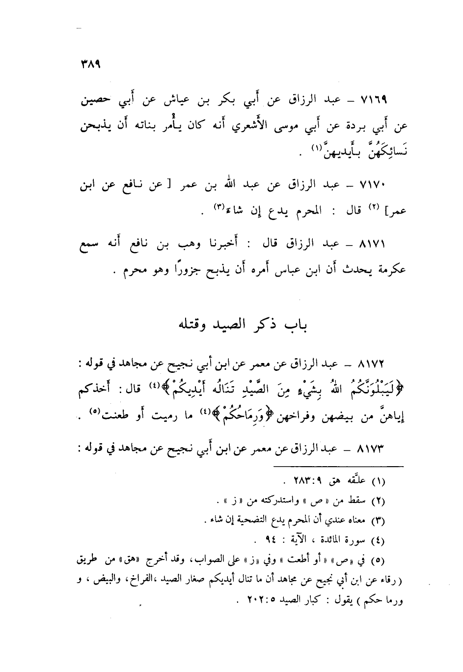 8172 - عَنْ مَعْمَرٍ، عَنِ ابْنِ أَبِي نَجِيحٍ، عَنْ مُجَاهِدٍ فِي قَوْلِهِ: {لَيَبْلُوَنَّكُمُ اللَّهُ بِشَيْءٍ مِنَ الصَّيْدِ تَنَالُهُ أَيْدِيكُمْ} [المائدة: 94] قَالَ: «§أَخْذُكُمْ إِيَّاهُنَّ مِنْ بَيْضِهِنَّ، وَفِرَاخِهِنَّ» {وَرِمَاحُكُمْ} [المائدة: 94] «مَا رَمَيْتَ أَوْ طَعَنْتَ»