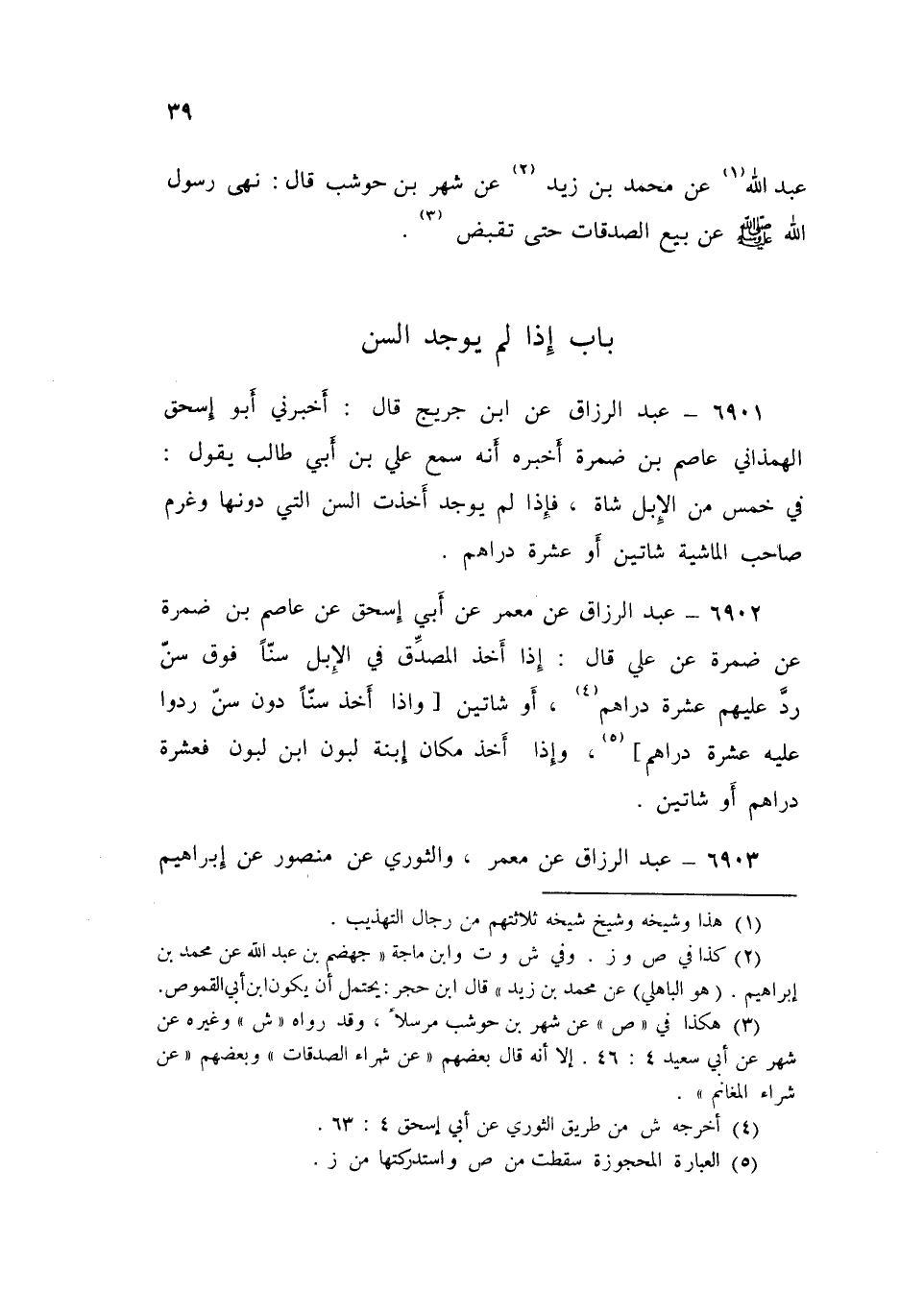 6901 - عَنِ ابْنِ جُرَيْجٍ قَالَ: أَخْبَرَنِي أَبُو إِسْحَاقَ الْهَمَذَانِيُّ عَنْ عَاصِمِ بْنِ ضَمْرَةَ، أَخْبَرَهُ أَنَّهُ، سَمِعَ عَلِيَّ بْنَ أَبِي طَالِبٍ يَقُولُ: «§فِي خَمْسٍ مِنَ الْإِبِلِ شَاةٌ، فَإِذَا لَمْ يُوجَدْ أُخِذَتِ السَّنُّ الَّتِي دُونَهَا، وَغُرِّمَ صَاحِبُ الْمَاشِيَةَ شَاتَيْنِ، أَوْ عَشَرَةَ دَرَاهِمَ»