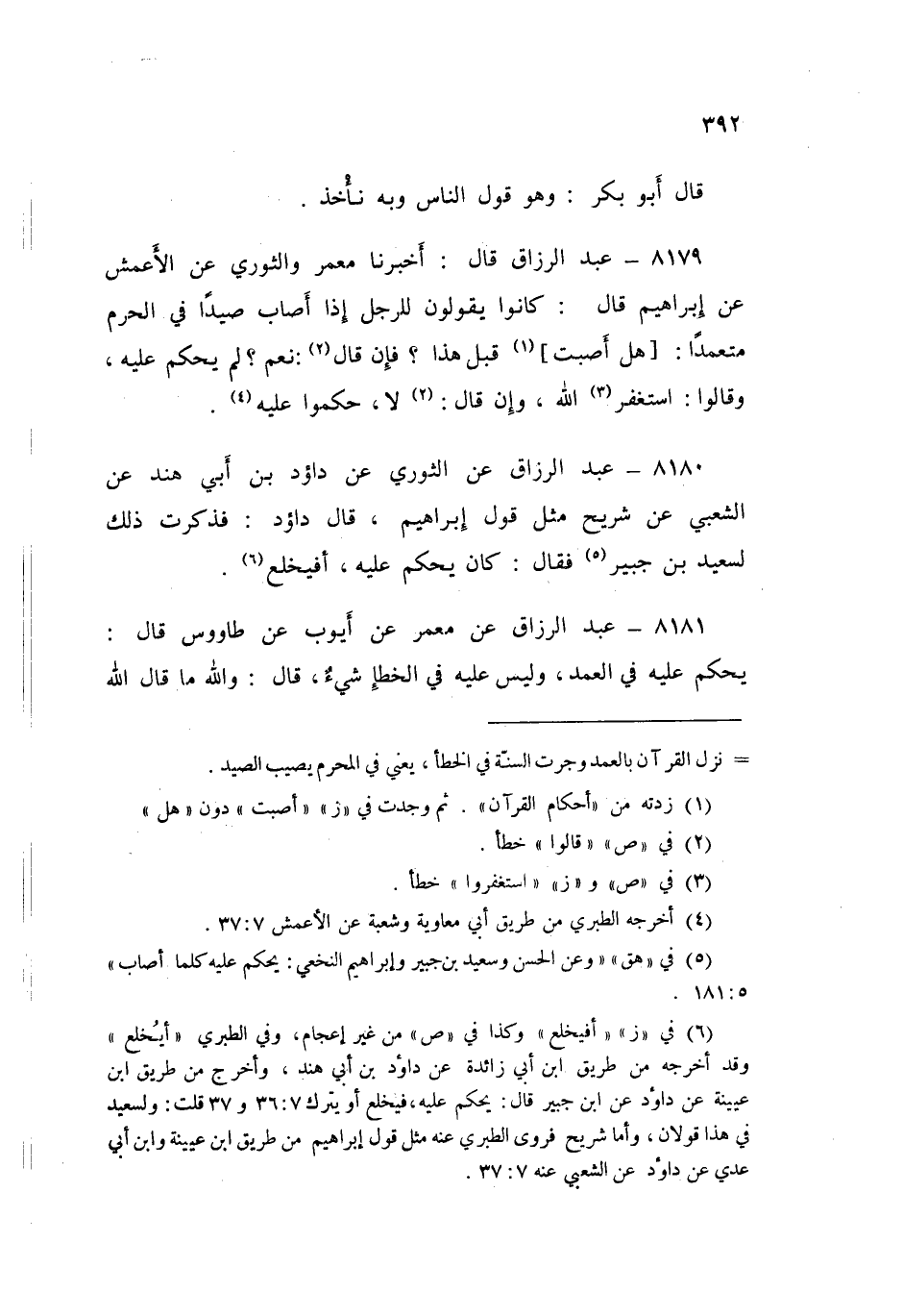 8181 - عَنْ مَعْمَرٍ، عَنْ أَيُّوبَ، عَنْ طَاوُسٍ قَالَ: «§يُحْكَمُ عَلَيْهِ فِي الْعَمْدِ، وَلَيْسَ عَلَيْهِ فِي الْخَطَإِ شَيْءٌ» قَالَ: «وَاللَّهِ مَا قَالَ اللَّهُ إِلَّا»: {وَمَنْ قَتَلَهُ مِنْكُمْ مُتَعَمِّدًا} [المائدة: 95]