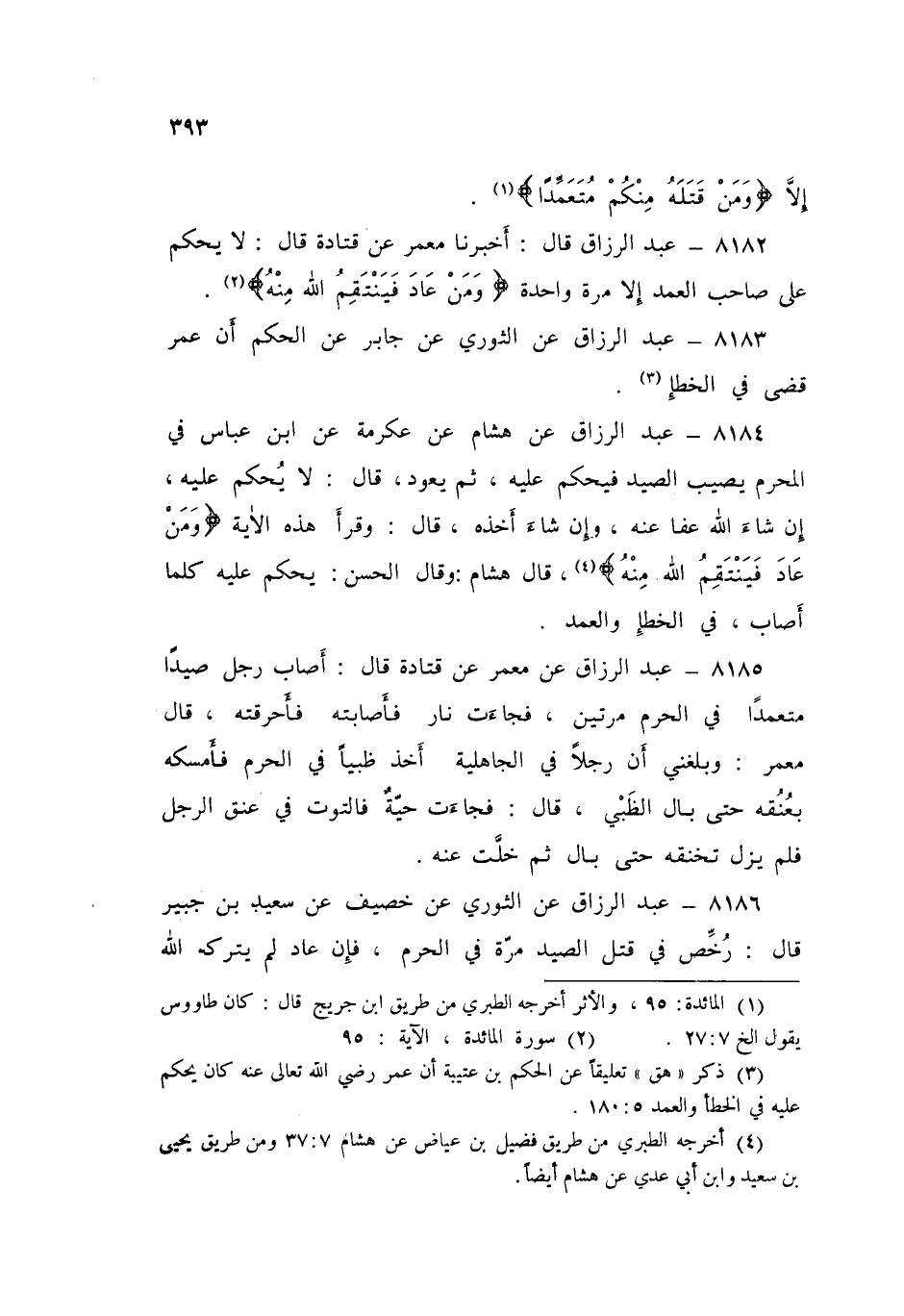 8186 - عَنِ الثَّوْرِيِّ، عَنْ خُصَيْفٍ، عَنْ سَعِيدِ بْنِ جُبَيْرٍ قَالَ: «§رُخِّصَ فِي قَتْلِ الصَّيْدِ مَرَّةً فِي الْحَرَمِ، فَإِنْ عَادَ لَمْ يَتْرُكْهُ اللَّهُ حَتَّى يَنْتَقِمَ مِنْهُ فِي الْعَمْدِ»