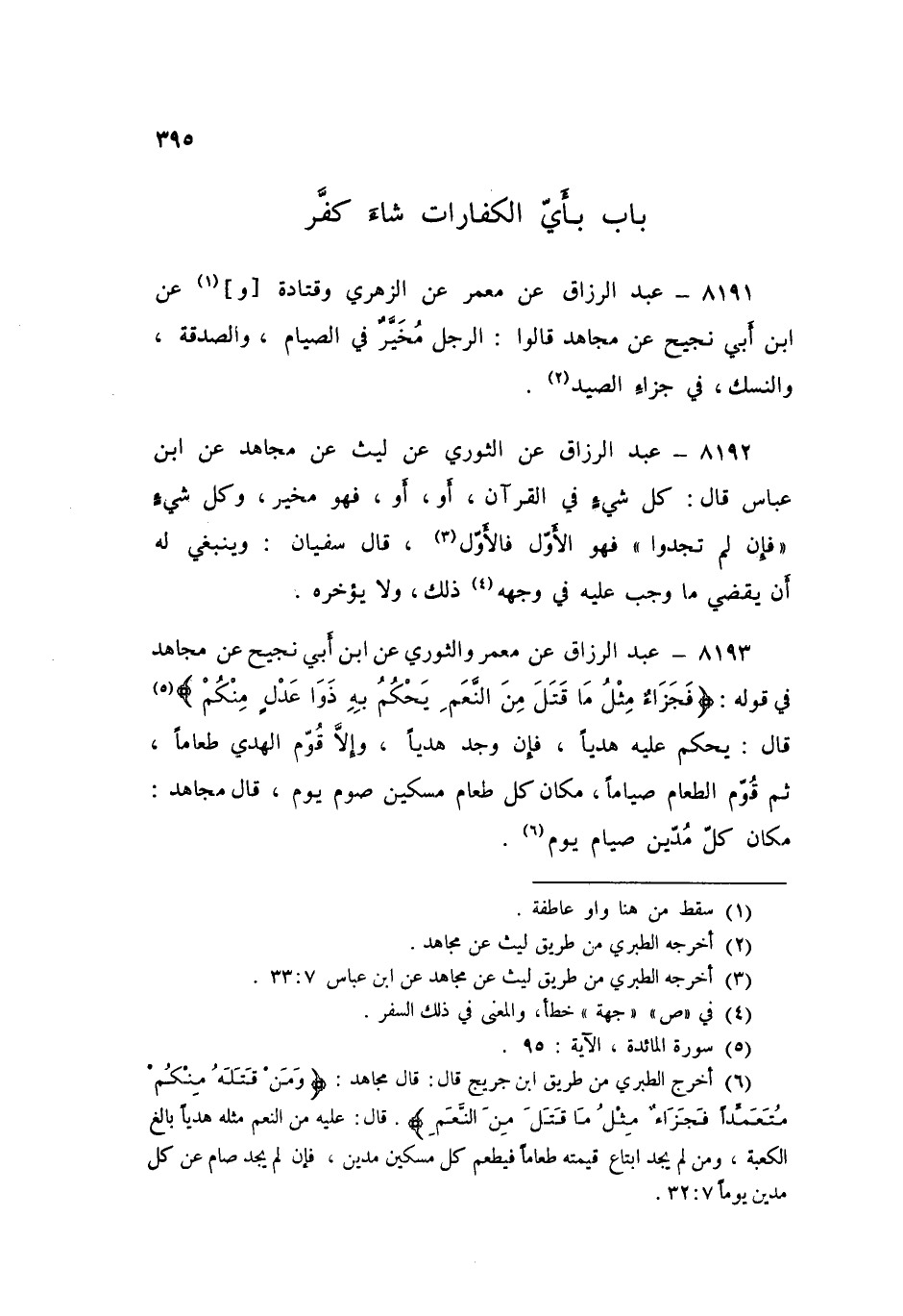 8191 - عَنْ مَعْمَرٍ، عَنِ الزُّهْرِيِّ، وَقَتَادَةَ، وَعَنِ ابْنِ أَبِي نَجِيحٍ، عَنْ مُجَاهِدٍ قَالُوا: «§الرَّجُلُ مُخَيَّرٌ فِي الصِّيَامِ، وَالصَّدَقَةِ، وَالنُّسُكِ فِي جَزَاءِ الصَّيْدِ»