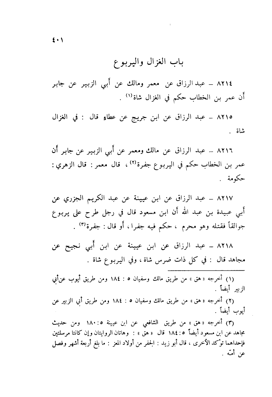 8214 - عَنْ مَعْمَرٍ، وَمَالِكٍ، عَنْ أَبِي الزُّبَيْرِ، عَنْ جَابِرٍ، «أَنَّ عُمَرَ بْنَ الْخَطَّابِ §حَكَمَ فِي الْغَزَالِ شَاةً»