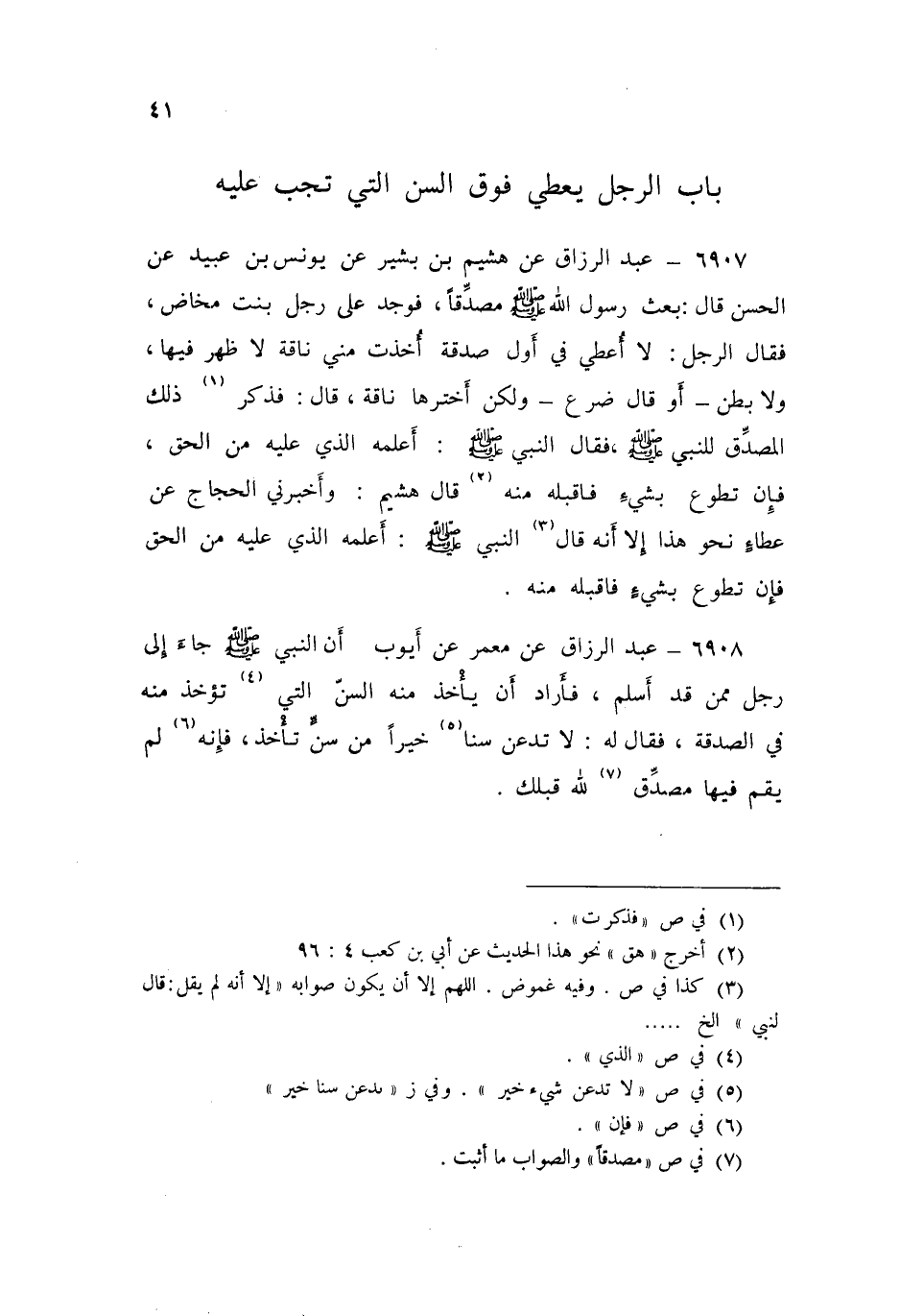 6908 - عَنْ مَعْمَرٍ، عَنْ أَيُّوبَ، أَنَّ النَّبِيَّ صَلَّى اللهُ عَلَيْهِ وَسَلَّمَ جَاءَ إِلَى رَجُلٍ مِمَّنْ قَدْ أَسْلَمَ، فَأَرَادَ أَنْ يَأْخُذَ مِنْهُ السِّنَّ الَّتِي تُؤْخَذُ مِنْهُ فِي الصَّدَقَةُ "، فَقَالَ لَهُ: «§لَا تَدَعَنَّ سِنًّا خَيْرًا مِنْ سِنٍّ تَأْخُذُ، فَإِنَّهُ لَمْ يَقُمْ فِيهَا مُصَدِّقٌ لِلَّهِ قَبْلَكَ»