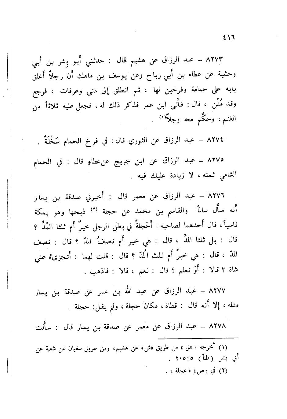 8276 - عَنْ مَعْمَرٍ قَالَ: أَخْبَرَنِي صَدَقَةُ بْنُ يَسَارٍ، أَنَّهُ سَأَلَ سَالِمًا، وَالْقَاسِمَ بْنَ مُحَمَّدٍ عَنْ حَجَلَةٍ ذَبَحَهَا وَهُوَ بِمَكَّةَ نَاسِيًا، قَالَ أَحَدُهُمَا لِصَاحِبِهِ: أَحَجَلَةٌ فِي بَطْنِ الرَّجُلِ خَيْرٌ أَمْ ثُلُثَا الْمُدِّ؟ قَالَ: «§بَلْ ثُلُثَا الْمُدِّ» قَالَ: هِيَ خَيْرٌ أَمْ نِصْفُ الْمُدِّ؟ قَالَ: «نِصْفُ الْمُدِّ» قَالَ: هِيَ خَيْرٌ أَمْ ثُلُثُ الْمُدِّ؟ قَالَ: قُلْتُ لَهُمَا: أَتُجْزِئُ عَنِّي شَاةٌ؟ قَالَا: «أَوَ تَعْلَمُ؟» قَالَ: نَعَمْ، قَالَا: «فَاذْهَبْ» عَبْدُ الرَّزَّاقِ،