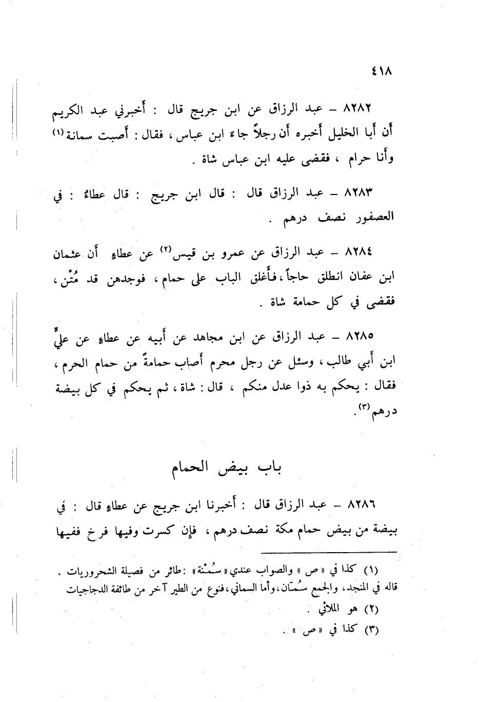 8283 - عَبْدُ الرَّزَّاقِ، قَالَ ابْنُ جُرَيْجٍ قَالَ: عَطَاءٌ: «§فِي الْعُصْفُورِ نِصْفُ دِرْهَمٍ»