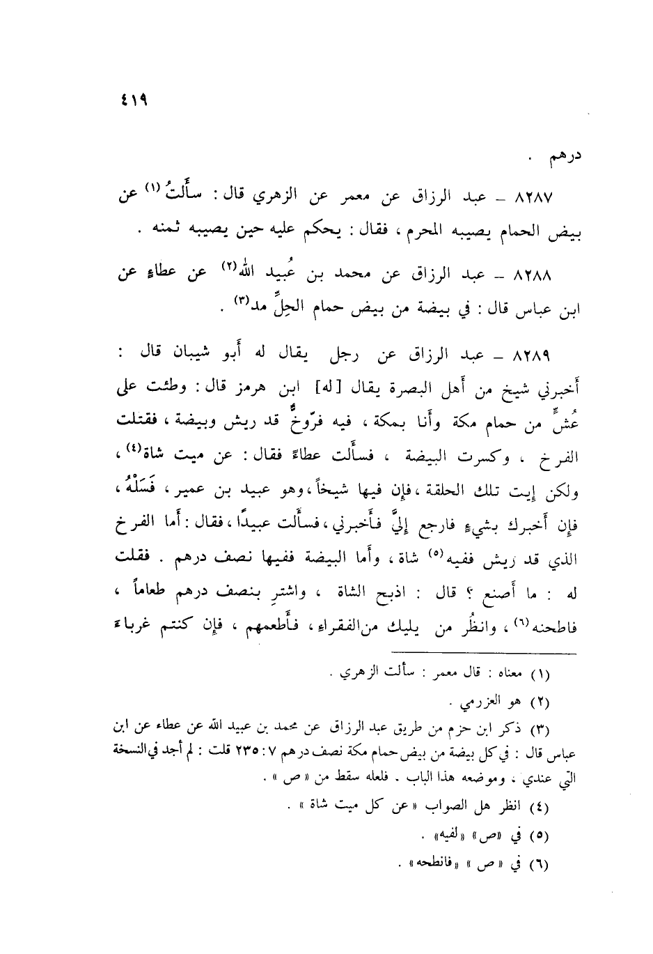 8289 - عَنْ رَجُلٍ يُقَالُ لَهُ أَبُو شَيْبَانَ قَالَ: أَخْبَرَنِي شَيْخٌ مِنْ أَهْلِ الْبَصْرَةِ يُقَالُ لَهُ ابْنُ هُرْمُزَ قَالَ: وَطِئْتُ عَلَى عُشٍّ مِنْ حَمَامِ مَكَّةَ، وَأَنَا بِمَكَّةَ فِيهِ فَرُّوخٌ قَدْ رِيشَ، وَبَيْضَةٌ، فَقَتَلْتُ الْفَرْخَ، وَكَسَرْتُ الْبَيْضَةَ، فَسَأَلْتُ عَطَاءً، فَقَالَ: عَنْ مَيْتٍ شَاةٌ وَلَكِنْ إِيتِ تِلْكَ الْحَلْقَةَ، فَإِنَّ فِيهَا شَيْخًا، وَهُوَ عُبَيْدُ بْنُ عُمَيْرٍ، فَسَلْهُ فَإِنْ أَخْبَرَكَ بِشَيْءٍ فَارْجِعْ إِلَيَّ فَأَخْبِرْنِي، فَسَأَلْتُ عُبَيْدًا، فَقَالَ: «§أَمَّا الْفَرْخُ الَّذِي قَدْ رِيشَ فَفِيهِ شَاةٌ، وَأَمَّا الْبَيْضَةُ فَفِيهَا نِصْفُ دِرْهَمٍ»، فَقُلْتُ لَهُ: مَا أَصْنَعُ؟ قَالَ: «اذْبَحِ الشَّاةَ، وَاشْتَرِ بِنِصْفِ دِرْهَمٍ طَعَامًا فَاطْحَنْهُ، وَانْظُرْ مَنْ يَلِيكَ مِنَ الفُقَرَاءِ فَأطْعِمْهُمْ، فَإِنْ كُنْتُمْ غُرَبَاءَ -[420]-، أَوْ بِكُمْ حَاجَةٌ فَأَمْسِكُوا مِنْهُ»، فَمَرَرْتُ بِعَطَاءٍ، فَأَخْبَرْتُهُ، فَقَالَ: هَكَذَا أَخْبَرَنِي ابْنُ عَبَّاسٍ