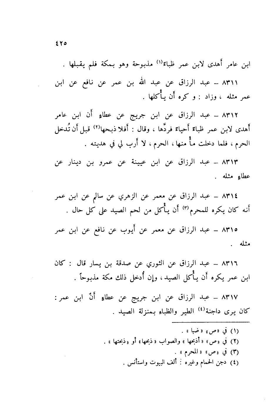 8316 - عَنِ الثَّوْرِيِّ، عَنْ صَدَقَةَ بْنِ يَسَارٍ قَالَ: «كَانَ ابْنُ عُمَرَ §يَكْرَهُ أَنْ يَأْكُلَ الصَّيْدَ، وَإِنْ أُدْخِلَ ذَلِكَ مَكَّةَ مَذْبُوحًا»