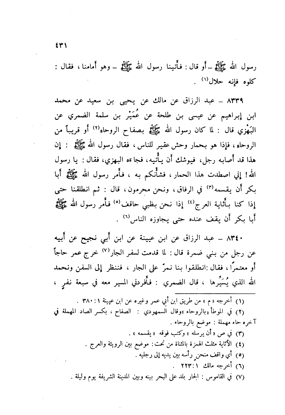 8339 - عَنْ مَالِكٍ، عَنْ يَحْيَى بْنِ سَعِيدٍ، عَنْ مُحَمَّدِ بْنِ إِبْرَاهِيمَ، عَنْ عِيسَى بْنِ طَلْحَةَ، عَنْ عُمَيْرِ بْنِ سَلَمَةَ الضُّمْرِيِّ، عَنِ الْبَهْزِيِّ قَالَ: لَمَّا كَانَ رَسُولُ اللَّهِ صَلَّى اللهُ عَلَيْهِ وَسَلَّمَ بِصِفَاحِ الرَّوْحَاءِ أَوْ قَرِيبًا مِنَ الرَّوْحَاءِ، فَإِذَا هُوَ بِحِمَارِ وَحْشٍ عَقْيَرُ لِلنَّاسِ، فَقَالَ رَسُولُ اللَّهِ صَلَّى اللهُ عَلَيْهِ وَسَلَّمَ: «إِنَّ هَذَا قَدْ أَصَابَهُ رَجُلٌ فَيُوشِكُ أَنْ يَأْتِيَهُ» فَجَاءَهُ الْبَهْزِيُّ فَقَالَ: يَا رَسُولَ اللَّهِ إِنِّي اصْطَدْتُ هَذَا الْحِمَارَ فَشَأْنُكُمْ بِهِ «§فَأَمَرَ رَسُولُ اللَّهِ صَلَّى اللهُ عَلَيْهِ وَسَلَّمَ أَبَا بَكْرٍ أَنْ يُقَسِّمَهُ فِي الرِّفَاقِ، وَنَحْنُ مُحْرِمُونَ» قَالَ: ثُمَّ انْطَلَقْنَا حَتَّى إِذَا كُنَّا بِأُثَايَةِ الْعَرَجِ إِذَا نَحْنُ بِظَبْيٍ حَاقِفٍ «فَأَمَرَ رَسُولُ اللَّهِ صَلَّى اللهُ عَلَيْهِ وَسَلَّمَ أَبَا بَكْرٍ أَنْ يَقِفَ عِنْدَهُ حَتَّى يُجَاوِزَهُ النَّاسُ»