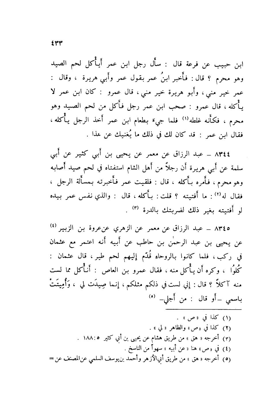 8345 - عَنْ مَعْمَرٍ، عَنِ الزُّهْرِيِّ، عَنْ عُرْوَةَ بْنِ الزُّبَيْرِ، عَنْ يَحْيَى بْنِ عَبْدِ الرَّحْمَنِ بْنِ حَاطِبٍ، عَنْ أَبِيهِ أَنَّهُ: اعْتَمَرَ مَعَ عُثْمَانَ فِي رَكْبٍ، فَلَمَّا كَانُوا بِالرَّوْحَاءِ قُدِّمَ إِلَيْهِمْ لَحْمُ طَيْرٍ، قَالَ عُثْمَانُ: «كُلُوا، وَكَرِهَ أَنْ يَأْكُلَ مِنْهُ»، فَقَالَ عَمْرُو بْنُ الْعَاصِ: أَنَأْكُلُ مِمَّا لَسْتَ مِنْهُ آكِلًا؟ قَالَ: " §إِنِّي لَسْتُ فِي ذَلِكُمْ مِثْلَكُمْ إِنَّمَا صِيدَتْ لِي، وَأُمِيتَتْ بِاسْمِي، أَوْ قَالَ: مِنْ أَجْلِي "