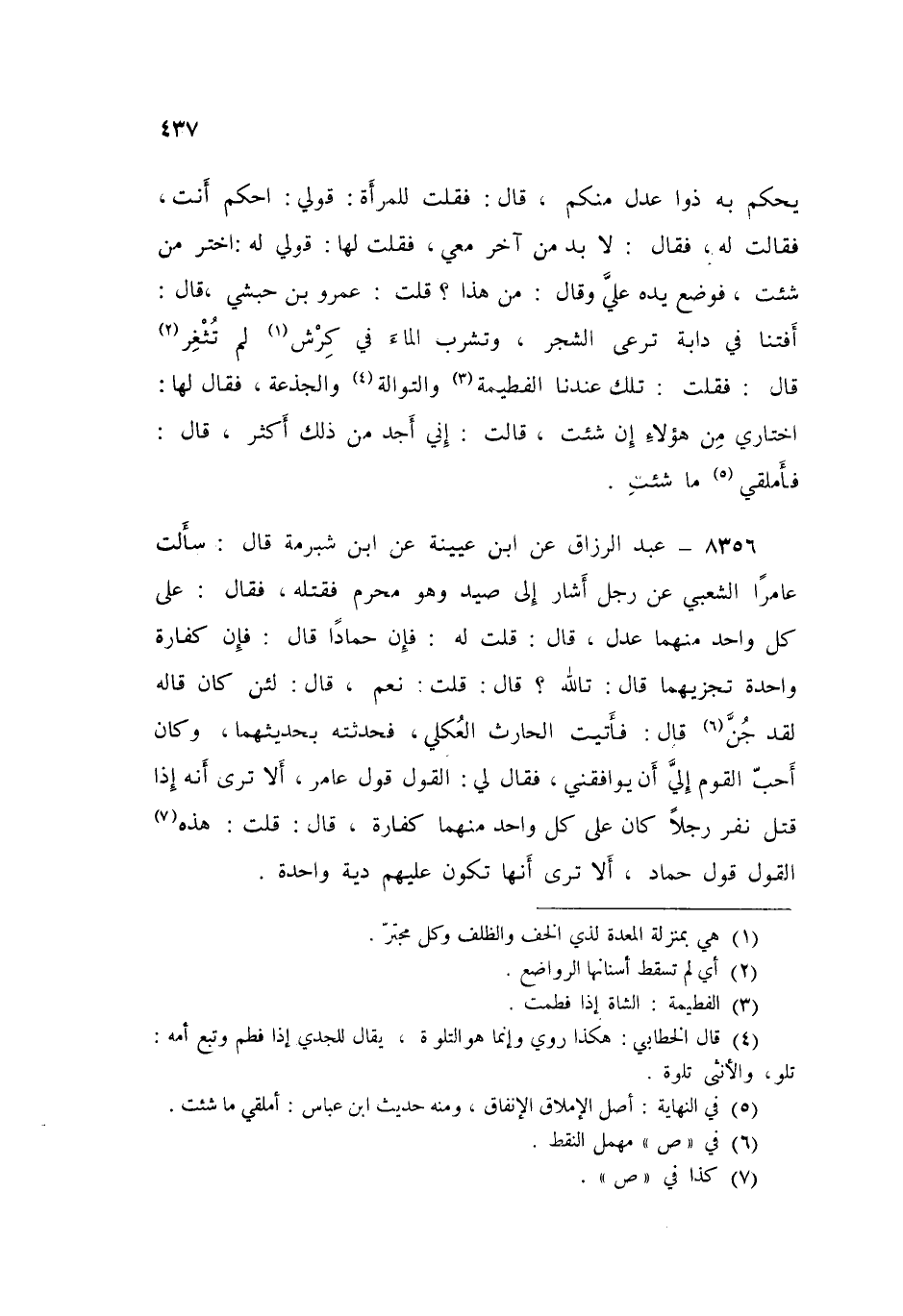 8356 - عَنِ ابْنِ عُيَيْنَةَ، عَنِ ابْنِ شُبْرُمَةِ قَالَ: سَأَلْتُ عَامِرًا الشَّعْبِيَّ عَنِ §رَجُلٍ أَشَارَ إِلَى صَيْدٍ وَهُوَ مُحْرِمٌ فَقَتَلَهُ، فَقَالَ: «عَلَى كُلِّ وَاحِدٍ مِنْهُمَا عَدْلٌ» قَالَ: قُلْتُ لَهُ: فَإِنَّ حَمَّادًا قَالَ: فَإِنَّ كَفَّارَةً وَاحِدَةً تُجْزِيهِمَا قَالَ: «تَاللَّهِ؟» قَالَ: قُلْتُ: نَعَمْ قَالَ: «لَئِنْ كَانَ قَالَهُ لَقَدْ جُنَّ» قَالَ: فَأَتَيْتُ الْحَارِثَ الْعُكْلِيَّ فَحَدَّثْتُهُ بِحَدِيثِهِمَا، وَكَانَ أَحَبَّ الْقَوْمِ إِلَيَّ أَنْ يُوافِقَنِي، فَقَالَ لِي: الْقَوْلُ قَوْلُ عَامِرٍ أَلَا تَرَى أَنَّهُ إِذَا قَتَلَ نَفَرٌ رَجُلًا كَانَ عَلَى كُلِّ وَاحِدٍ مِنْهُمَا كَفَّارَةٌ قَالَ: قُلْتُ: هَذَا الْقَوْلُ قَوْلُ حَمَّادٍ أَلَا تَرَى أَنَّهَا تَكُونُ عَلَيْهِمْ دِيَةٌ وَاحِدَةٌ