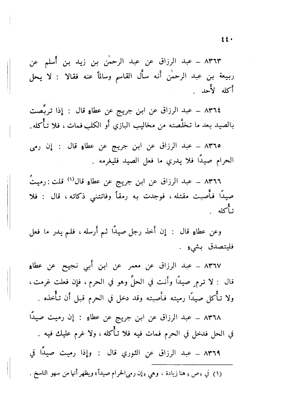 8366 - عَنِ ابْنِ جُرَيْجٍ، عَنْ عَطَاءٍ قَالَ: قُلْتُ: §رَمَيْتُ صَيْدًا فَأَصَبْتُ مَقْتَلَهُ، فَوَجَدْتُ بِهِ رَمَقًا وَفَاتَتْنِي ذَكَاتُهُ قَالَ: «فَلَا تَأْكُلْهُ» وَعَنْ عَطَاءٍ قَالَ: «إِنْ أَخَذَ رَجُلٌ صَيْدًا، ثُمَّ أَرْسَلَهُ فَلَمْ يَدْرِ مَا فَعَلَ فَلْيَتَصَدَّقْ بِشَيْءٍ»