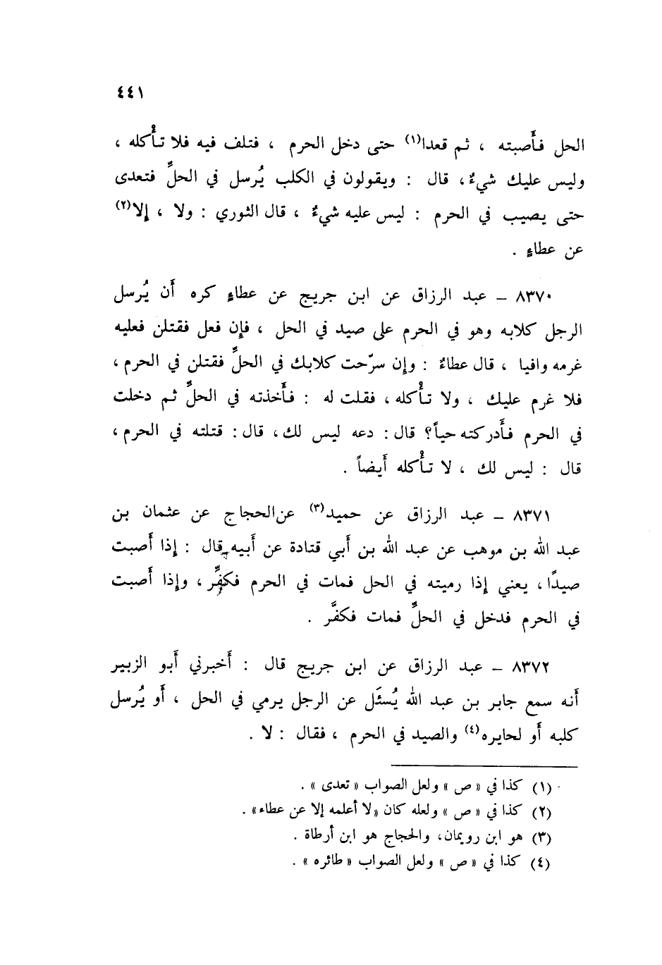8371 - عَنْ حُمَيْدٍ، عَنِ الْحَجَّاجِ، عَنْ عُثْمَانَ بْنِ عَبْدِ اللَّهِ بْنِ مَوْهِبٍ، عَنْ عَبْدِ اللَّهِ بْنِ أَبِي قَتَادَةَ، عَنْ أَبِيهِ قَالَ: «§إِذَا أَصَبْتَ صَيْدًا - يَعْنِي إِذَا رَمَيْتَهُ - فِي الْحِلِّ فَمَاتَ فِي الْحَرَمِ فَكَفِّرْ وَإِذَا أَصَبْتَ فِي الْحَرَمِ فَدَخَلَ فِي الْحِلِّ فَمَاتَ فَكَفِّرْ»