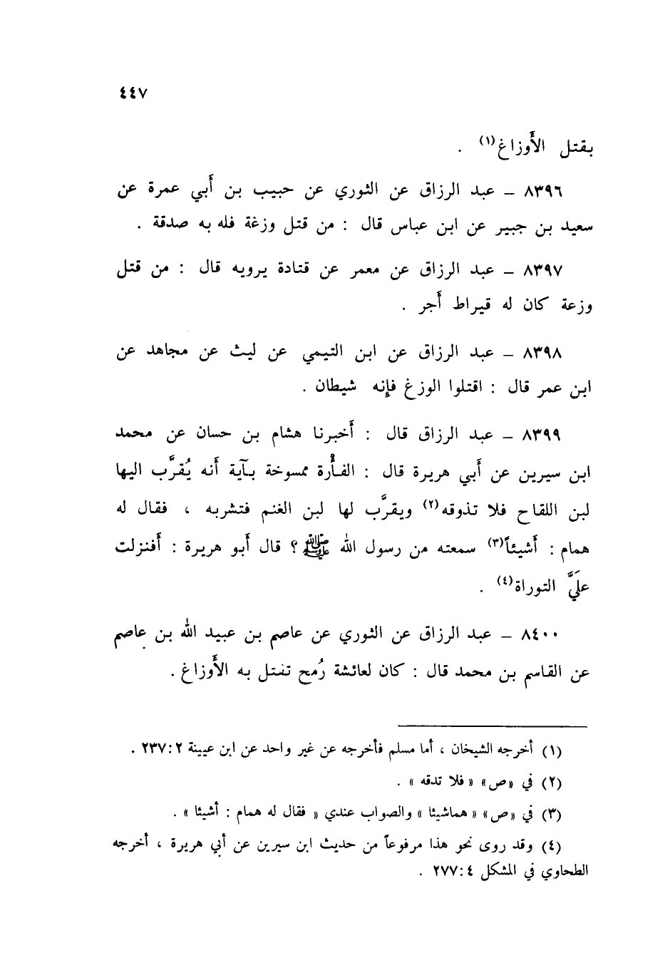8397 - عَنْ مَعْمَرٍ، عَنْ قَتَادَةَ يَرْوِيهِ قَالَ: «§مَنْ قَتَلَ وَزَغَةً كَانَ لَهُ قِيرَاطُ أَجْرٍ»