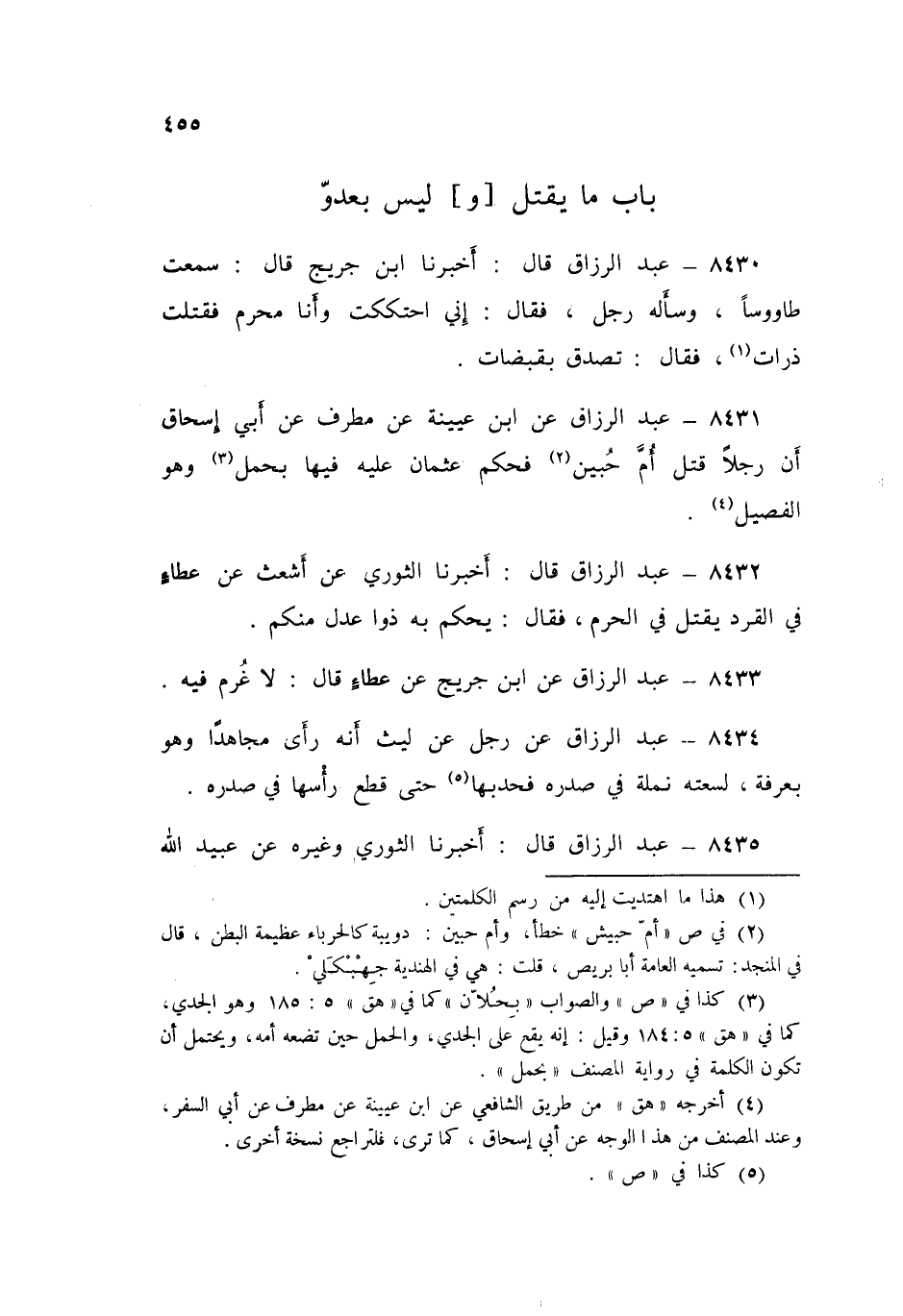 8432 - قَالَ: أَخْبَرَنَا الثَّوْرِيُّ، عَنْ أَشْعَثَ، عَنْ عَطَاءٍ فِي §الْقَرَدِ يُقْتَلُ فِي الْحَرَمِ؟ فَقَالَ: «يَحْكُمُ بِهِ ذَوَا عَدْلٍ مِنْكُمْ»