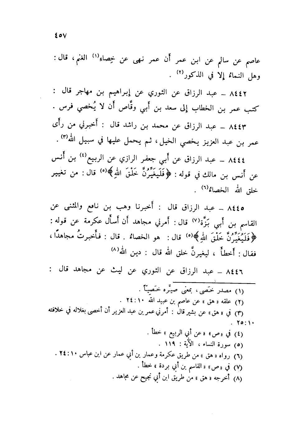 8445 - عَبْدُ الرَّزَّاقِ، أَخْبَرَنَا وَهْبُ بْنُ نَافِعٍ، وَالْمُثَنَّى، عَنِ الْقَاسِمِ بْنِ أَبِي بَزَّةَ قَالَ: أَمَرَنِي مُجَاهِدٌ أَنْ أَسْأَلَ عِكْرِمَةَ عَنْ قَوْلِهِ: {فَلَيُغَيِّرُنَّ خَلْقَ اللَّهِ} [النساء: 119] قَالَ: «§هُوَ الْخِصَاءُ» قَالَ: فَأَخْبَرْتُ مُجَاهِدًا فَقَالَ: «أَخْطَأَ، لَيُغَيِّرُنَّ خَلْقَ اللَّهِ» قَالَ: دِينُ اللَّهِ، عَبْدُ الرَّزَّاقِ،