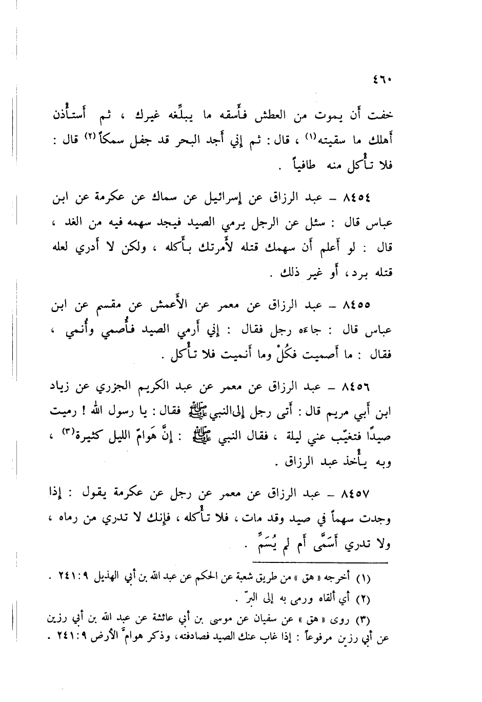 8456 - عَنْ مَعْمَرٍ، عَنْ عَبْدِ الْكَرِيمِ الْجَزَرِيِّ، عَنْ زِيَادِ بْنِ أَبِي مَرْيَمَ قَالَ: أَتَى رَجُلٌ إِلَى النَّبِيِّ صَلَّى اللهُ عَلَيْهِ وَسَلَّمَ فَقَالَ: يَا رَسُولَ اللَّهِ رَمَيْتُ صَيْدًا فَتَغَيَّبَ عَنِّي لَيْلَةً، فَقَالَ النَّبِيُّ صَلَّى اللهُ عَلَيْهِ وَسَلَّمَ: «إِنَّ §هَوَامَّ اللَّيْلِ كَثِيرَةٌ» وَبِهِ يَأْخُذُ عَبْدُ الرَّزَّاقِ