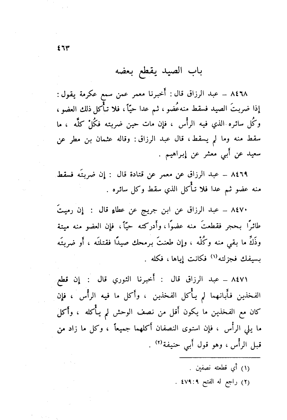 8468 - قَالَ: أَخْبَرَنَا مَعْمَرٌ، عَمَّنَ، سَمِعَ عِكْرِمَةَ يَقُولُ: «§إِذَا ضَرَبْتَ الصَّيْدَ فَسَقَطَ مِنْهُ عُضْوٌ، ثُمَّ عَدَا حَيًّا فَلَا تَأْكُلْ ذَلِكَ الْعُضْوَ، وَكُلْ سَائِرَهُ الَّذِي فِيهِ الرَّأْسُ، فَإِنْ مَاتَ حِينَ ضَرَبْتَهُ فَكُلْ كُلَّهُ مَا سَقَطَ مِنْهُ، وَمَا لَمْ يَسْقُطْ»، قَالَ عَبْدُ الرَّزَّاقِ: وَقَالَهُ عُثْمَانُ بْنُ مَطَرٍ، عَنْ سَعِيدٍ، عَنْ أَبِي مَعْشَرٍ، عَنْ إِبْرَاهِيمَ