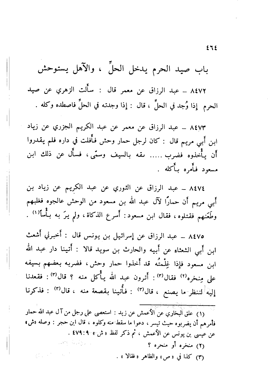 8473 - عَنْ مَعْمَرٍ، عَنْ عَبْدِ الْكَرِيمِ الْجَزَرِيِّ، عَنْ زِيَادِ بْنِ أَبِي مَرْيَمَ قَالَ: كَانَ §لِرَجُلٍ حِمَارُ وَحْشٍ، فَأَفْلَتَ فِي دَارِهِ فَلَمْ يَقْدِرُوا أَنْ يَأْخُذُوهُ، فَضَرَبَ عُنُقَهُ بِالسَّيْفِ وَسَمَّى، فَسَأَلَ عَنْ ذَلِكَ ابْنَ مَسْعُودٍ «فَأَمَرَهُ بِأَكْلِهِ»