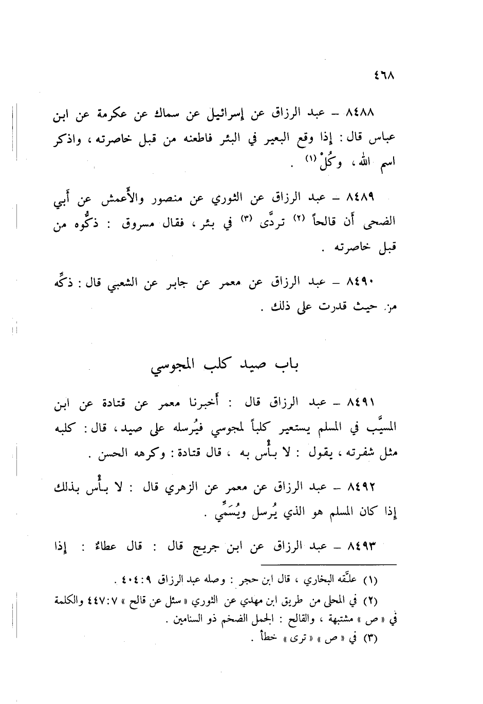 8491 - قَالَ: أَخْبَرَنَا مَعْمَرٌ، عَنْ قَتَادَةَ، عَنِ ابْنِ الْمُسَيِّبِ فِي §الْمُسْلِمِ يَسْتَعِيرُ كَلْبًا لِمَجُوسِيٍّ فَيُرْسِلَهُ عَلَى صَيْدٍ؟ قَالَ: «كَلْبُهُ مِثْلُ شَفْرَتِهِ» يَقُولُ: «لَا بَأْسَ بِهِ»، قَالَ قَتَادَةُ: وَكَرِهَهُ الْحَسَنُ