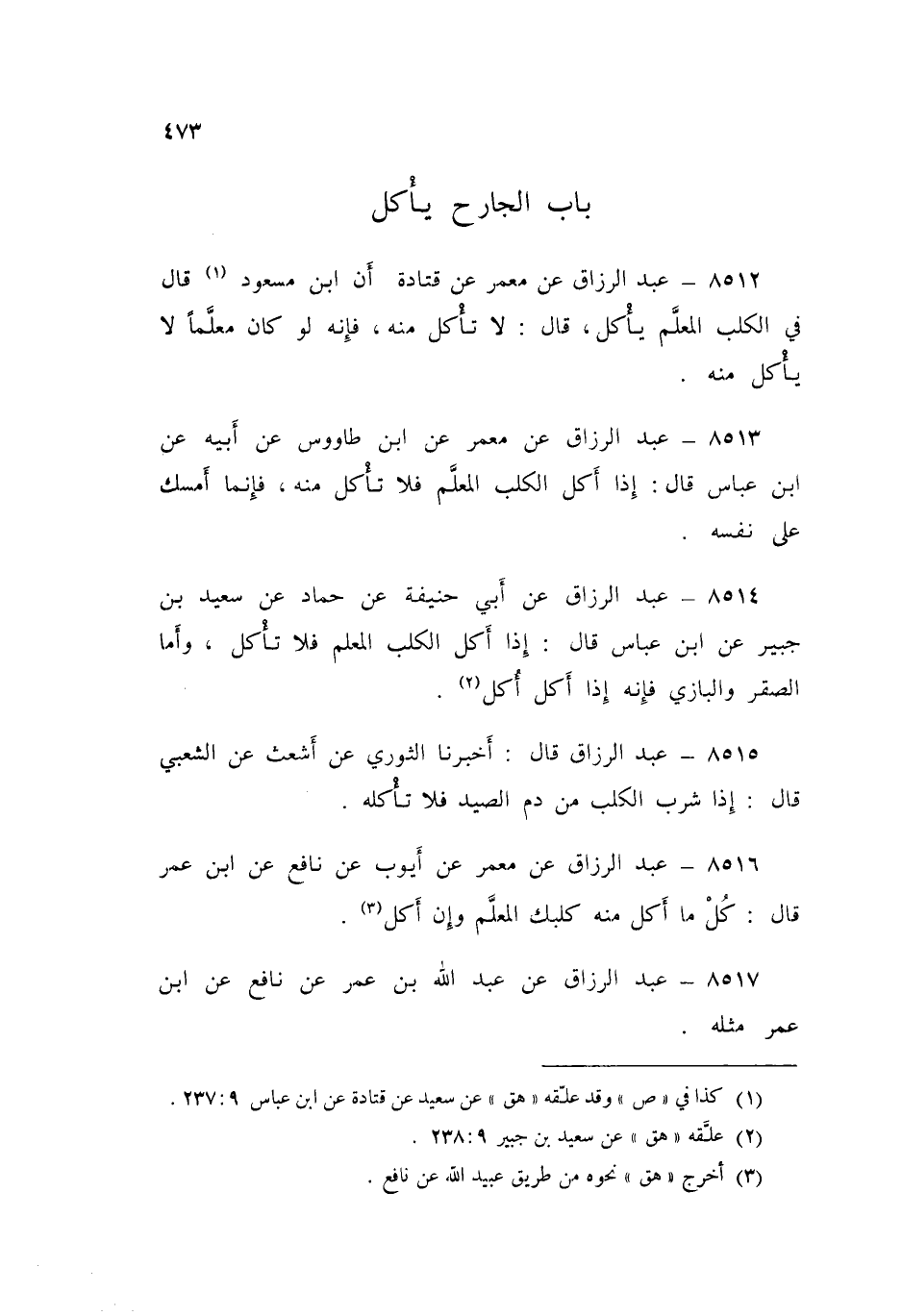 8516 - عَنْ مَعْمَرٍ، عَنْ أَيُّوبَ، عَنْ نَافِعٍ، عَنِ ابْنِ عُمَرَ قَالَ: «§كُلْ مَا أَكَلَ مِنْهُ كَلْبُكَ الْمُعَلَّمُ، وَإِنْ أَكَلَ»، عَبْدُ الرَّزَّاقِ،