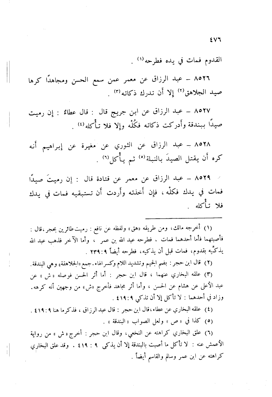 8527 - عَنِ ابْنِ جُرَيْجٍ قَالَ: قَالَ عَطَاءٌ: «إِنْ §رَمَيْتَ صَيْدًا بِبُنْدُقَةٍ، وَأَدْرَكْتَ ذَكَاتَهُ فَكُلْهُ، وَإِلَّا فَلَا تَأْكُلْهُ»