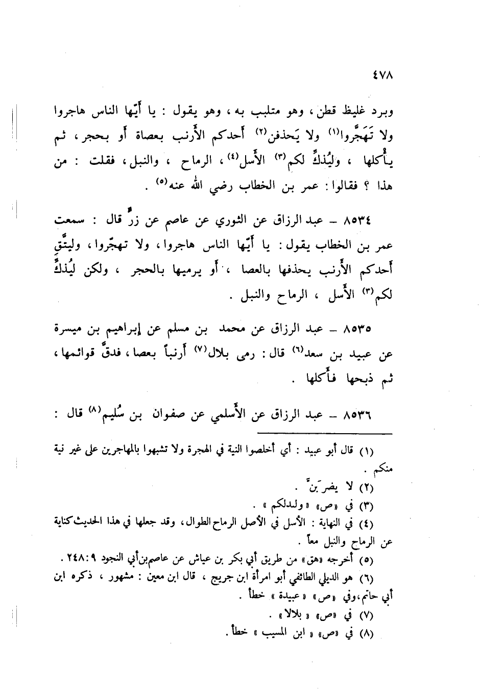 8535 - عَنْ مُحَمَّدِ بْنِ مُسْلِمٍ، عَنْ إِبْرَاهِيمَ بْنِ مَيْسَرَةَ، عَنْ عُبَيْدِ بْنِ سَعْدٍ قَالَ: «§رَمَى بِلَالٌ أَرْنَبًا بِعَصَا فَدَقَّ قَوَائِمَهَا، ثُمَّ ذَبَحَهَا فَأَكَلَهَا»
