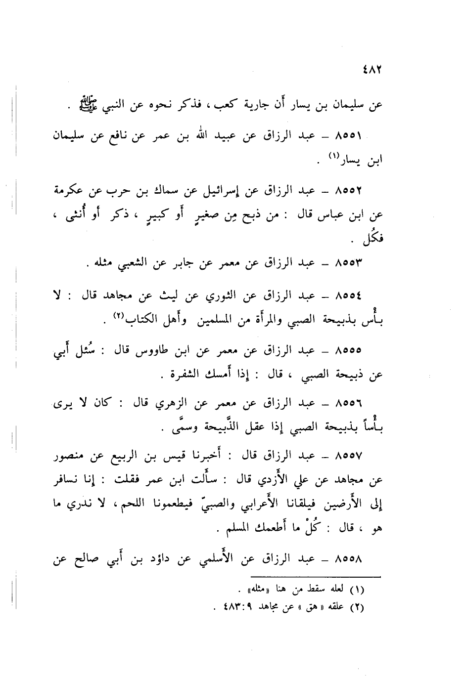 8555 - عَنْ مَعْمَرٍ، عَنِ ابْنِ طَاوُسٍ قَالَ: سُئِلَ أَبِي عَنْ ذَبِيحَةِ الصَّبِيِّ؟ قَالَ: «§إِذَا أَمْسَكَ الشَّفْرَةَ»