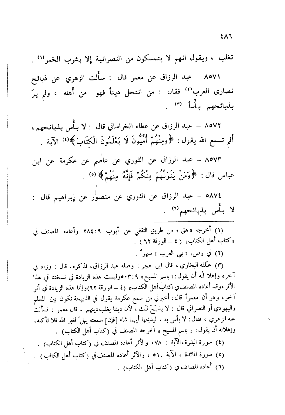 8572 - عَبْدُ الرَّزَّاقِ، عَنْ عَطَاءٍ الْخُرَاسَانِيِّ قَالَ: «§لَا بَأْسَ بِذَبَائِحِهِمْ»، أَلَمْ تَسْمَعِ اللَّهَ يَقُولُ: {وَمِنْهُمْ أُمِيُّونَ لَا يَعْلَمُونَ الْكِتَابَ} [البقرة: 78] الْآيَةُ