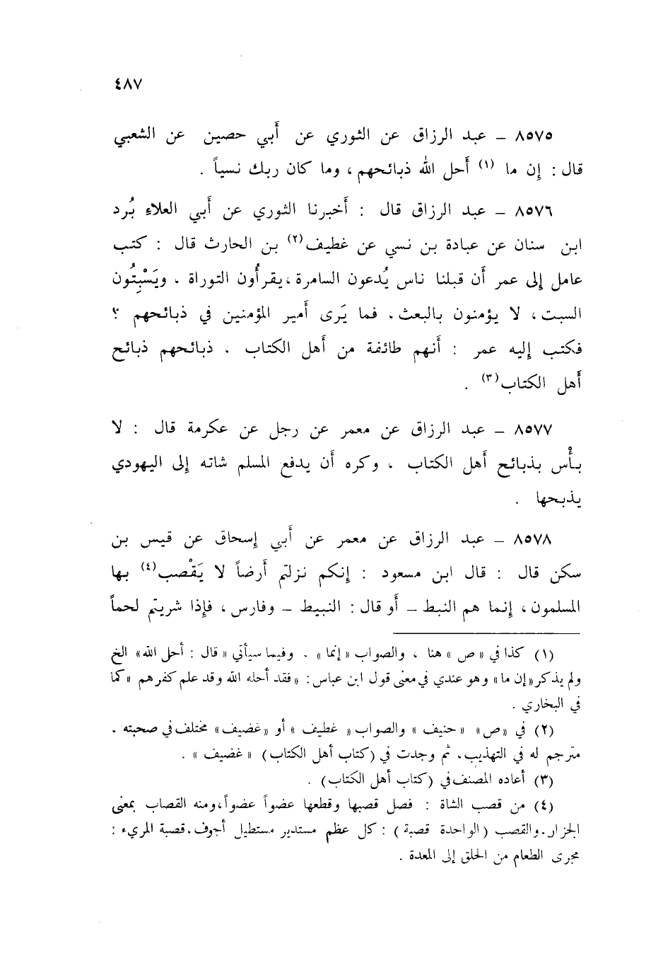 8578 - عَنْ مَعْمَرٍ، عَنْ أَبِي إِسْحَاقَ، عَنْ قَيْسِ بْنِ سَكَنٍ قَالَ: قَالَ ابْنُ مَسْعُودٍ: " §إِنَّكُمْ نَزَلْتُمْ أَرْضًا لَا يَقْصِبُ بِهَا الْمُسْلِمُونَ إِنَّمَا هُمُ النَّبَطُ، - أَوْ قَالَ: النَّبِيطُ - وَفَارِسُ، فَإِذَا شَرَيْتُمْ لَحْمًا فَسَلُوا، فَإِنْ كَانَ ذَبِيحَةَ يَهُودِيٍّ أَوْ نَصْرَانِيٍّ فَكُلُوهُ؛ فَإِنَّ طَعَامَهُمْ حِلٌّ لَكُمْ "