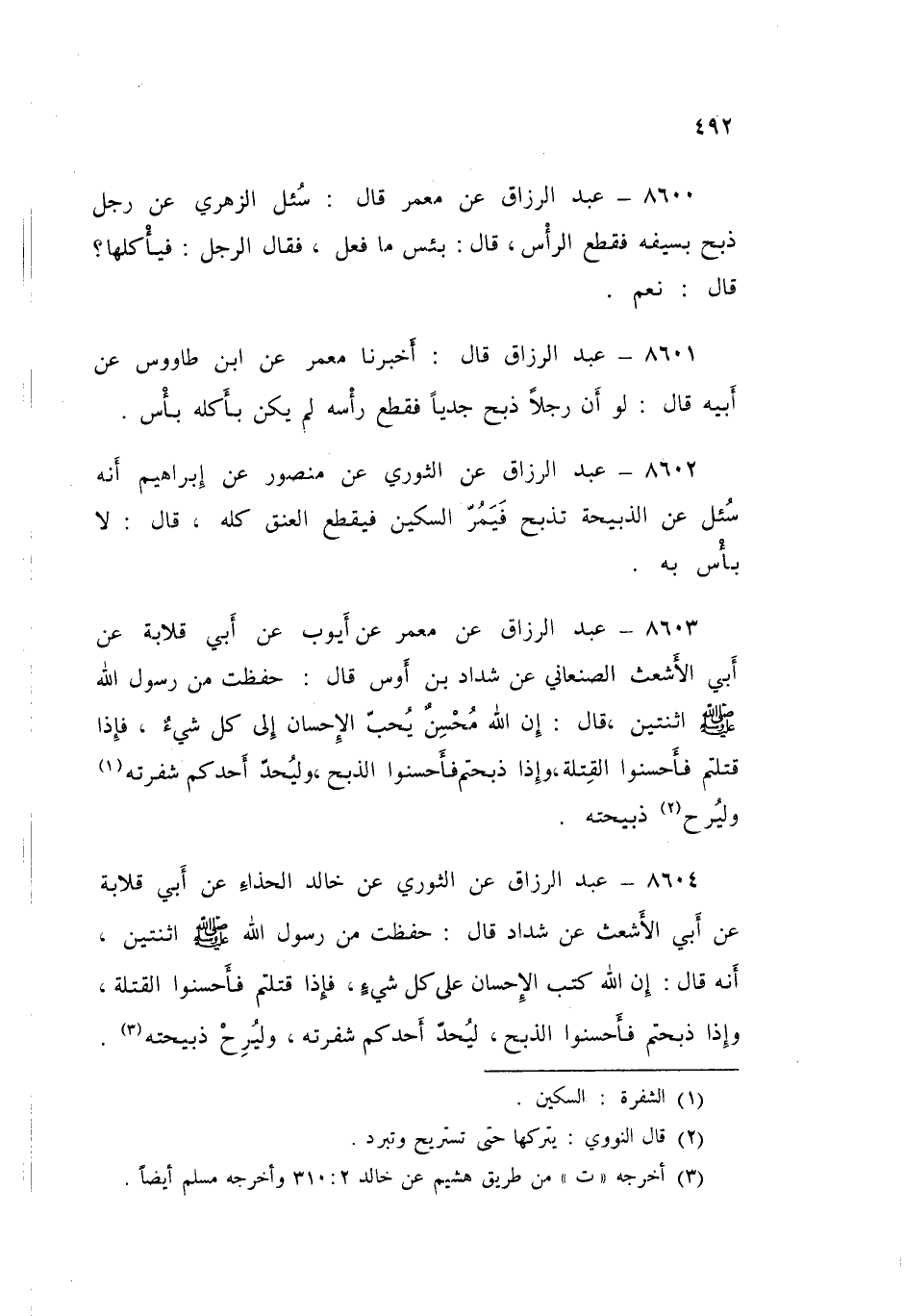 8603 - عَنْ مَعْمَرٍ، عَنْ أَيُّوبَ، عَنْ أَبِي قِلَابَةَ، عَنْ أَبِي الْأَشْعَثِ الصَّنَعَانِيِّ، عَنْ شَدَّادِ بْنِ أَوْسٍ قَالَ: حَفِظْتُ مِنْ رَسُولِ اللَّهِ صَلَّى اللهُ عَلَيْهِ وَسَلَّمَ اثْنَتَيْنِ قَالَ: «إِنَّ §اللَّهَ مُحْسِنٌ يُحِبُّ الْإِحْسَانَ إِلَى كُلِّ شَيْءٍ، فَإِذَا قَتَلْتُمْ فَأَحْسِنُوا الْقِتْلَةَ، وَإِذَا ذَبَحْتُمْ فَأَحْسِنُوا الذَّبْحَ، وَلْيُحِدَّ أَحَدُكُمْ شَفْرَتَهُ، وَلْيُرِحْ ذَبِيحَتَهُ»