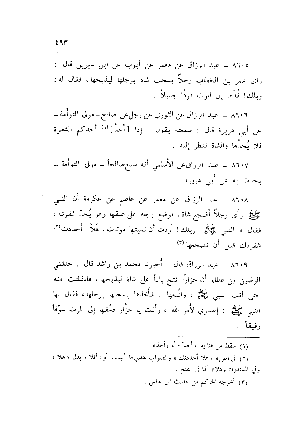 8606 - عَنِ الثَّوْرِيِّ، عَنْ رَجُلٍ، عَنْ صَالِحٍ، مَوْلَى التَّوْأَمَةِ، عَنْ أَبِي هُرَيْرَةَ قَالَ: سَمِعْتُهُ يَقُولُ: «§إِذَا أَحَدَّ أَحَدُكُمُ الشَّفْرَةَ فَلَا يُحِدَّهَا، وَالشَّاةُ تَنْظُرُ إِلَيْهِ»، عَبْدُ الرَّزَّاقِ،