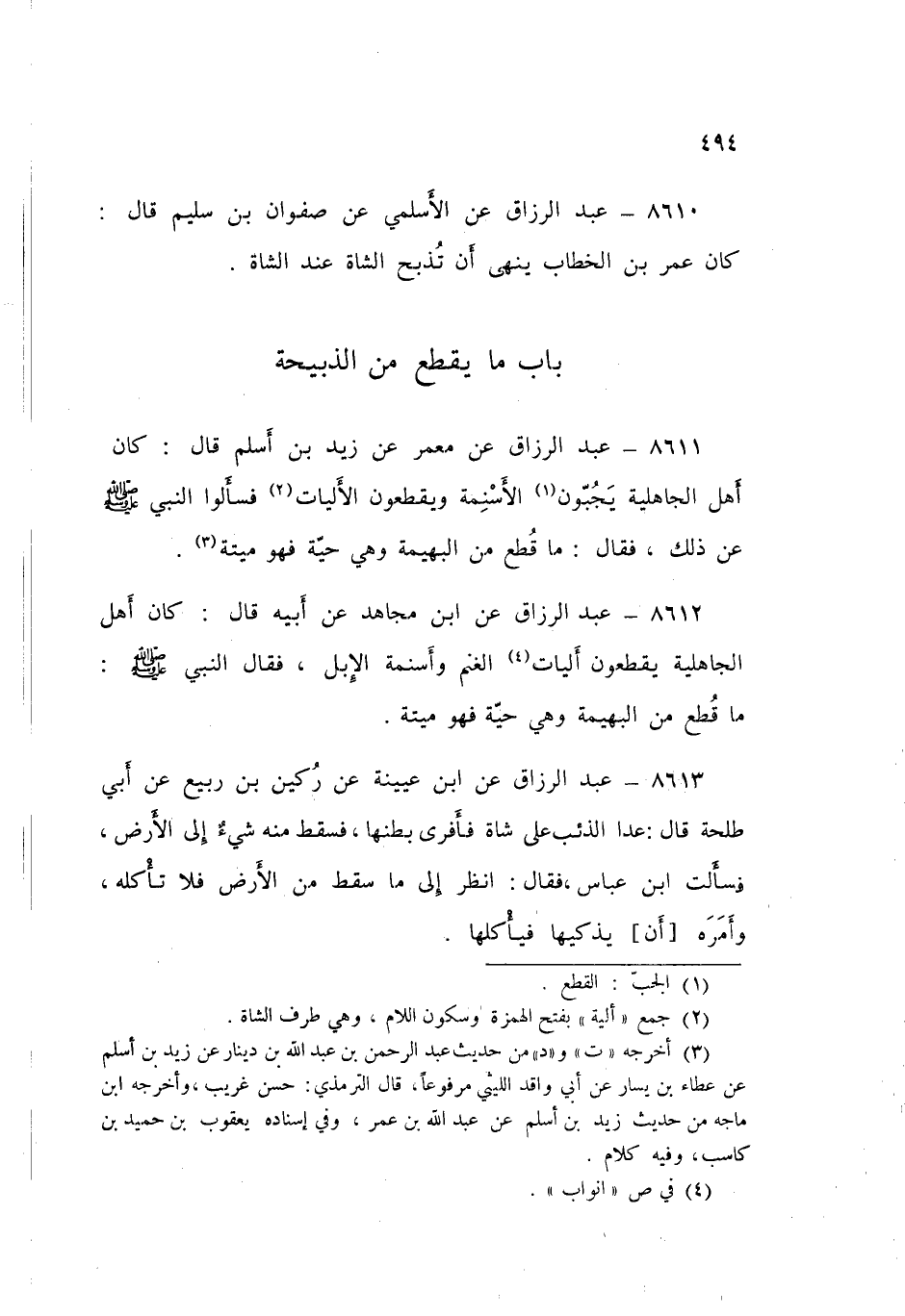 8611 - عَنْ مَعْمَرٍ، عَنْ زَيْدِ بْنِ أَسْلَمَ قَالَ: كَانَ أَهْلُ الْجَاهِلَيَّةِ يَجُبُّونَ الْأَسْنِمَةَ، وَيَقْطَعُونَ الْأَلِيَّاتِ، فَسَأَلُوا النَّبِيَّ صَلَّى اللهُ عَلَيْهِ وَسَلَّمَ عَنْ ذَلِكَ؟ فَقَالَ: «§مَا قُطِعَ مِنَ الْبَهِيمَةِ، وَهِيَ حَيَّةٌ فَهُوَ مَيْتَةٌ»