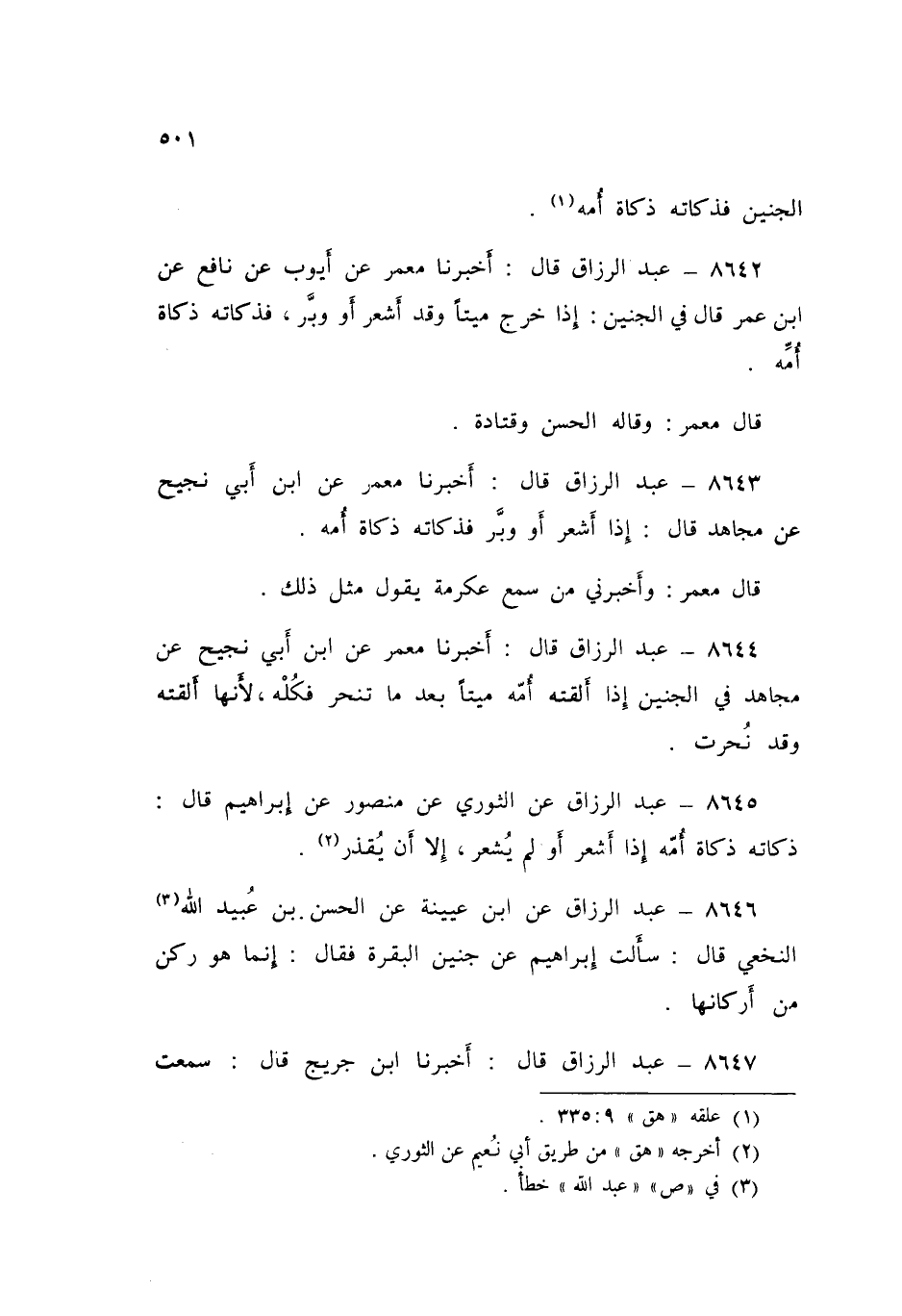 8647 - قَالَ: أَخْبَرَنَا ابْنُ جُرَيْجٍ قَالَ: سَمِعْتُ دَاوُدَ بْنَ أَبِي عَاصِمٍ يَقُولُ: نَزَلْتُ دَارًا بِالْمَدِينَةِ، §فَنَحَرْتُ فِيهَا نَاقَةً، فَأَلْقَتْ حَوَارًا مِنْ بَطْنِهَا مَيِّتًا - يَعْنِي الْجَنِينَ الَّذِي لَمْ يُشْعِرْ -، فَسَأَلْتُ ابْنَ الْمُسَيِّبِ، فَقَالَ: «كُلْهُ» قَالَ: فَانْقَلَبْتُ فَأَخَذْتُهُ، وَظَلَلْتُ مِنْهُ عَلَى كَبِدٍ، وَسِنَامٍ مَا شِئْتُ