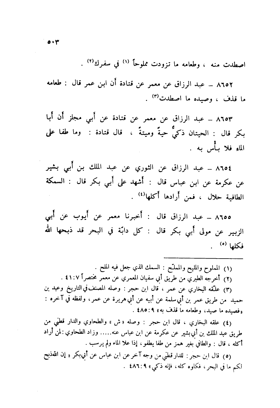 8655 - قَالَ: أَخْبَرَنَا مَعْمَرٌ، عَنْ أَيُّوبَ، عَنْ أَبِي الزُّبَيْرِ، عَنْ مَوْلَى أَبِي بَكْرٍ قَالَ: «§كُلُّ دَابَّةٍ فِي الْبَحْرِ قَدْ ذَبَحَهَا اللَّهُ فَكُلْهَا»