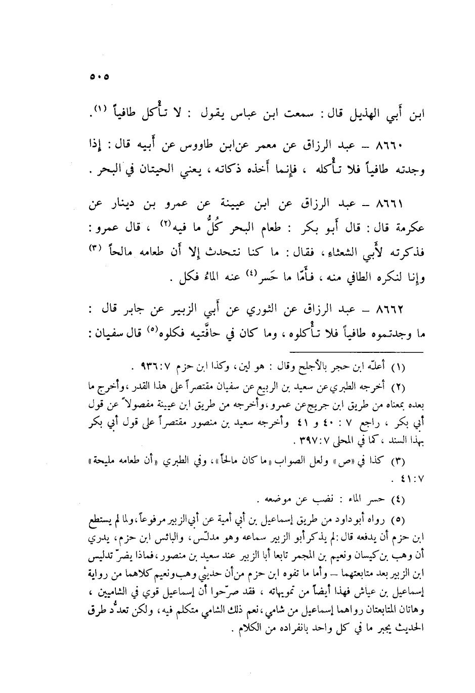 8662 - عَنِ الثَّوْرِيِّ، عَنْ أَبِي الزُّبَيْرِ، عَنْ جَابِرٍ قَالَ: «§مَا وَجَدْتُمُوهُ طَافِيًا فَلَا تَأْكُلُوهُ، وَمَا كَانَ فِي حَافَّتَيْهِ فَكُلُوهُ»، قَالَ سُفْيَانُ: «لَا يُجْزَرُ إِلَّا عَنْ حَيٍّ».
