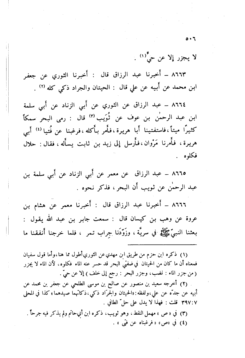 8664 - عَنِ الثَّوْرِيِّ، عَنْ أَبِي الزِّنَادِ، عَنْ أَبِي سَلَمَةَ بْنِ عَبْدِ الرَّحْمَنِ بْنِ عَوْفٍ، عَنْ ثُوَيْبٍ قَالَ: §رَمَى الْبَحْرُ سَمَكًا كَثِيرًا مَيِّتًا، فَاسْتَفْتَيْنَا أَبَا هُرَيْرَةَ «فَأَمَرَ بِأَكْلِهِ»، فَرَغِبْنَا عَنْ فُتْيَا أَبِي هُرَيْرَةَ، فَأَمَرْنَا مَرْوَانَ، فَأَرْسَلَ إِلَى زَيْدِ بْنِ ثَابِتٍ يَسْأَلُهُ فَقَالَ: «حَلَالٌ فَكُلُوهُ»، عَبْدُ الرَّزَّاقِ،