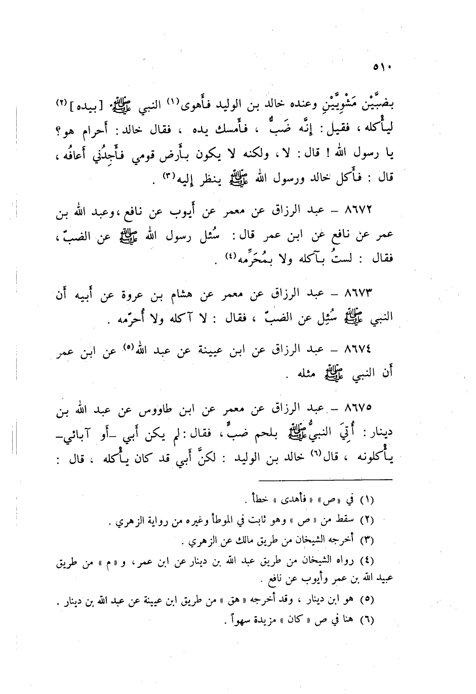 8675 - عَنْ مَعْمَرٍ، عَنِ ابْنِ طَاوُسٍ، عَنْ عَبْدِ اللَّهِ بْنِ دِينَارٍ، أُتِيَ النَّبِيُّ صَلَّى اللهُ عَلَيْهِ وَسَلَّمَ بِلَحْمِ ضَبِّ، فَقَالَ: «§لَمْ يَكُنْ أَبِي أَوْ آبَائِي يَأْكُلُونَهُ» قَالَ خَالِدُ بْنُ الْوَلِيدِ: لَكِنَّ أَبِي قَدْ كَانَ يَأْكُلُهُ قَالَ: فَأَكَلَ مِنْهُ خَالِدٌ، وَالنَّبِيُّ صَلَّى اللهُ عَلَيْهِ وَسَلَّمَ يَنْظُرُ إِلَيْهِ