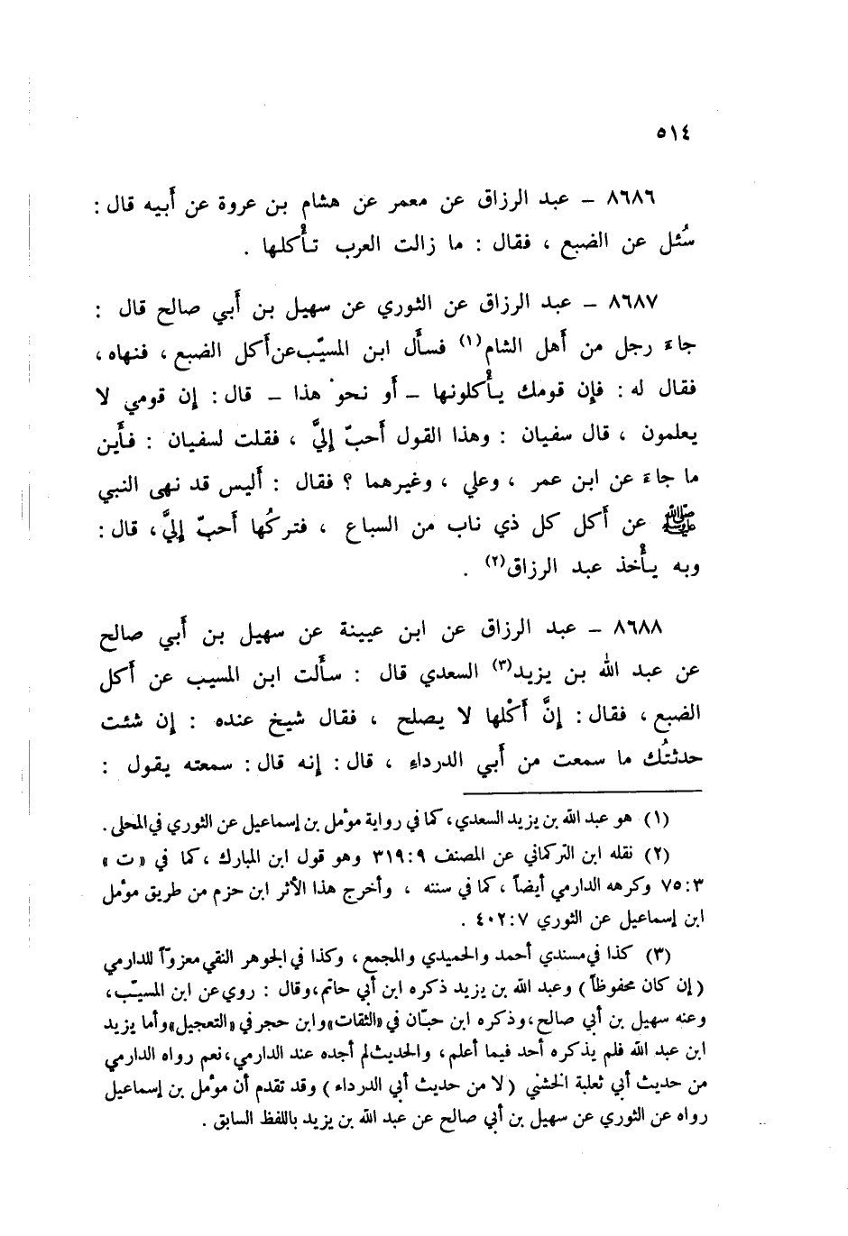 8687 - عَنِ الثَّوْرِيِّ، عَنْ سُهَيْلِ بْنِ أَبِي صَالِحٍ قَالَ: جَاءَ رَجُلٌ مِنْ أَهْلِ الشَّامِ فَسَأَلَ ابْنَ الْمُسَيِّبِ عَنْ أَكْلِ الضَّبُعِ فَنَهَاهُ، فَقَالَ لَهُ: فَإِنَّ قَوْمَكَ يَأْكُلُونَهَا، - أَوْ نَحْوَ هَذَا - قَالَ: إِنَّ قَوْمِي لَا يَعْلَمُونَ - قَالَ سُفْيَانُ: وَهَذَا الْقَوْلُ أَحَبُّ إِلَيَّ -، فَقُلْتُ لِسُفْيَانَ: فَأَيْنَ مَا جَاءَ عَنِ ابْنِ عُمَرَ، وَعَلِيٍّ وَغَيْرِهِمَا؟ فَقَالَ: أَلَيْسَ قَدْ «§نَهَى النَّبِيُّ صَلَّى اللهُ عَلَيْهِ وَسَلَّمَ عَنْ أَكْلِ كُلِّ ذِي نَابٍ مِنَ السِّبَاعِ؟» فَتَرْكُهَا أَحَبُّ إِلَيَّ قَالَ: وَبِهِ يَأْخُذُ عَبْدُ الرَّزَّاقِ