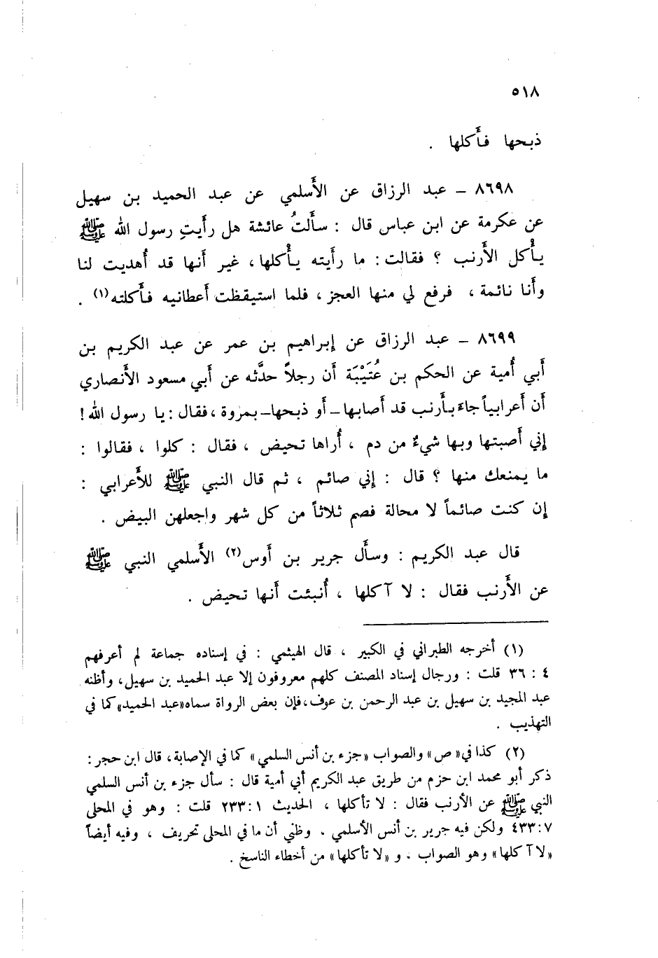 قَالَ عَبْدُ الْكَرِيمِ: وَسَأَلَ جَرِيرُ بْنُ أَوْسٍ الْأَسْلَمِيُّ النَّبِيَّ صَلَّى اللهُ عَلَيْهِ وَسَلَّمَ عَنِ الْأَرْنَبِ؟ فَقَالَ: «§لَا آكُلُهَا أُنْبِئْتُ أَنَّهَا تَحِيضُ»