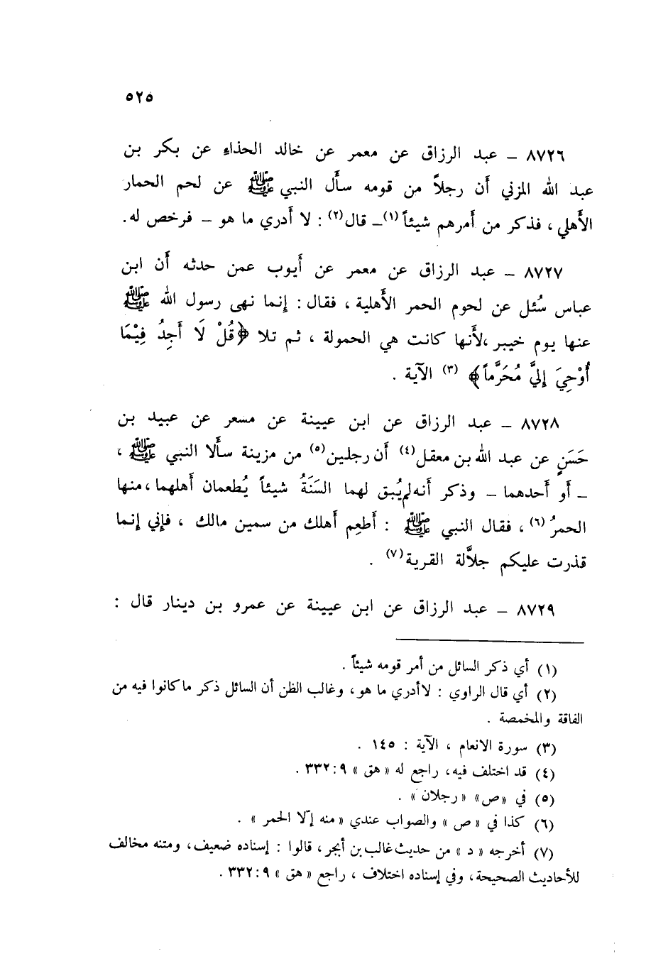 8729 - عَنِ ابْنِ عُيَيْنَةَ، عَنْ عَمْرِو بْنِ دِينَارٍ قَالَ: قُلْتُ لِأَبِي الشَّعْثَاءِ: إِنَّهُمْ يَقُولُونَ: «إِنَّ النَّبِيَّ صَلَّى اللهُ عَلَيْهِ وَسَلَّمَ §أَمَرَهُمْ أَنْ يُكْفِئُوا الْقُدُورَ مِنْ لُحُومِ الْحُمُرِ»، فَقَالَ: لَقَدْ كَانَ الْحَكَمُ بْنُ عَمْرٍو الْغِفَارِيُّ يَقُولُ ذَلِكَ، فَأَبَى ذَلِكَ الْبَحْرُ - يَعْنِي ابْنَ عَبَّاسٍ - {قُلْ لَا أَجِدُ فِيمَا أُوحِيَ إِلَيَّ} الْآيَةَ