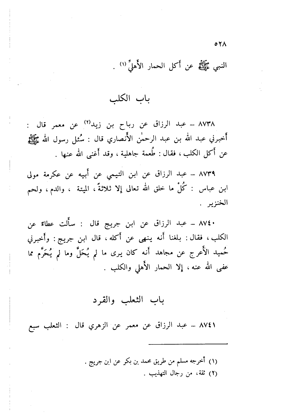 8740 - عَنِ ابْنِ جُرَيْجٍ قَالَ: سَأَلْتُ عَطَاءً عَنِ الْكَلْبِ؟ فَقَالَ: بَلَغَنَا أَنَّهُ «§يَنْهَى عَنْ أَكْلِهِ»