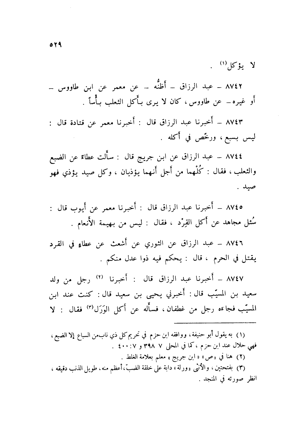 8745 - عَبْدُ الرَّزَّاقِ قَالَ: أَخْبَرَنَا مَعْمَرٌ، عَنْ أَيُّوبَ قَالَ: سُئِلَ مُجَاهِدٌ عَنْ أَكْلِ الْقِرْدِ؟ فَقَالَ: «§لَيْسَ مِنْ بَهِيمَةِ الْأَنْعَامِ»