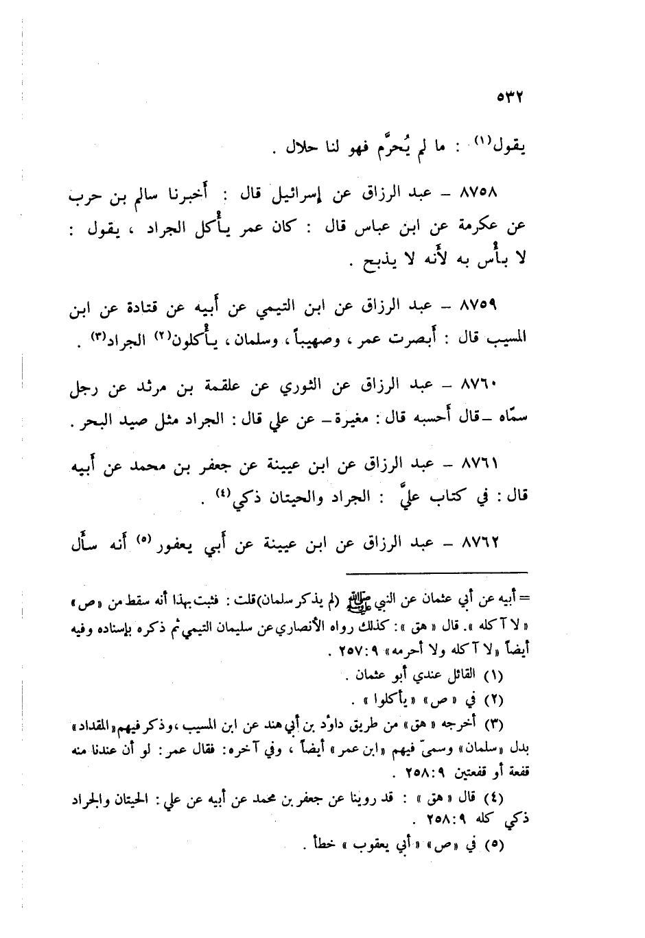 8761 - عَنِ ابْنِ عُيَيْنَةَ، عَنْ جَعْفَرِ بْنِ مُحَمَّدٍ، عَنْ أَبِيهِ قَالَ: فِي كِتَابِ عَلِيٍّ «§الْجَرَادُ، وَالْحِيتَانُ ذَكِيٌّ»